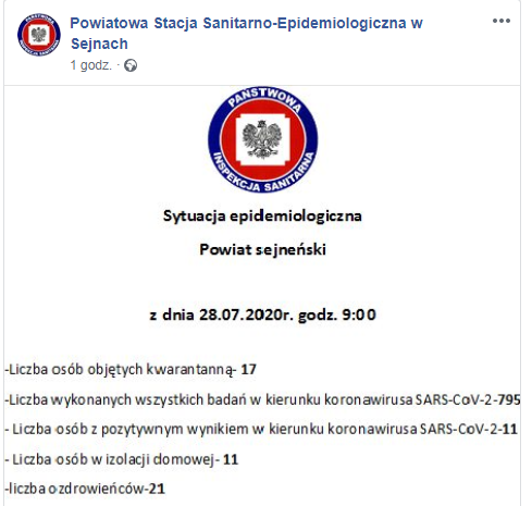 Wyzdrowiało kolejnych 19 osób (w sumie 833): trzy kobiety w sile wieku, nastolatka, dwóch starszych mężczyzn i dwie starsze kobiety z powiatu grajewskiego, kobieta w sile wieku, dwoje dzieci, mężczyzna w sile wieku, młody mężczyzna i dwie młode kobiety z Suwałk, młody mężczyzna z powiatu monieckiego, dwóch mężczyzn w sile wieku i kobieta w sile wieku z Łomży.