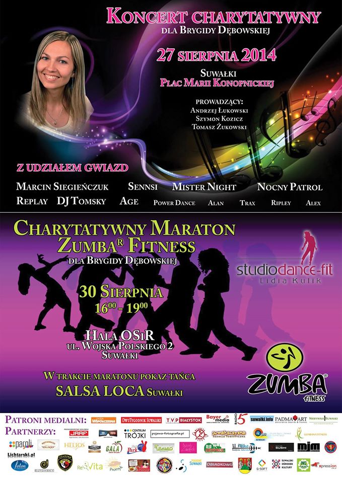 Z kolei w sobotę, 30 sierpnia o godz. 16,00 w hali OSiR, przy ul. Wojska Polskiego 2, odbędzie się Charytatywny Maraton Zumba(R)Fitness dla Brygidy Dębowskiej.