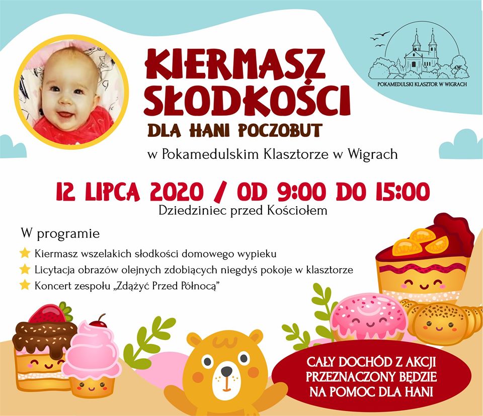 Również Pokamedulski Klasztor w Wigrach włącza się do akcji pomocy dla Hani Poczobut z Ełku. W niedzielę, 12 lipca na terenie kompleksu odbędzie się "Kiermasz Słodkości", z którego dochód przeznaczony będzie właśnie na leczenie dziewczynki.