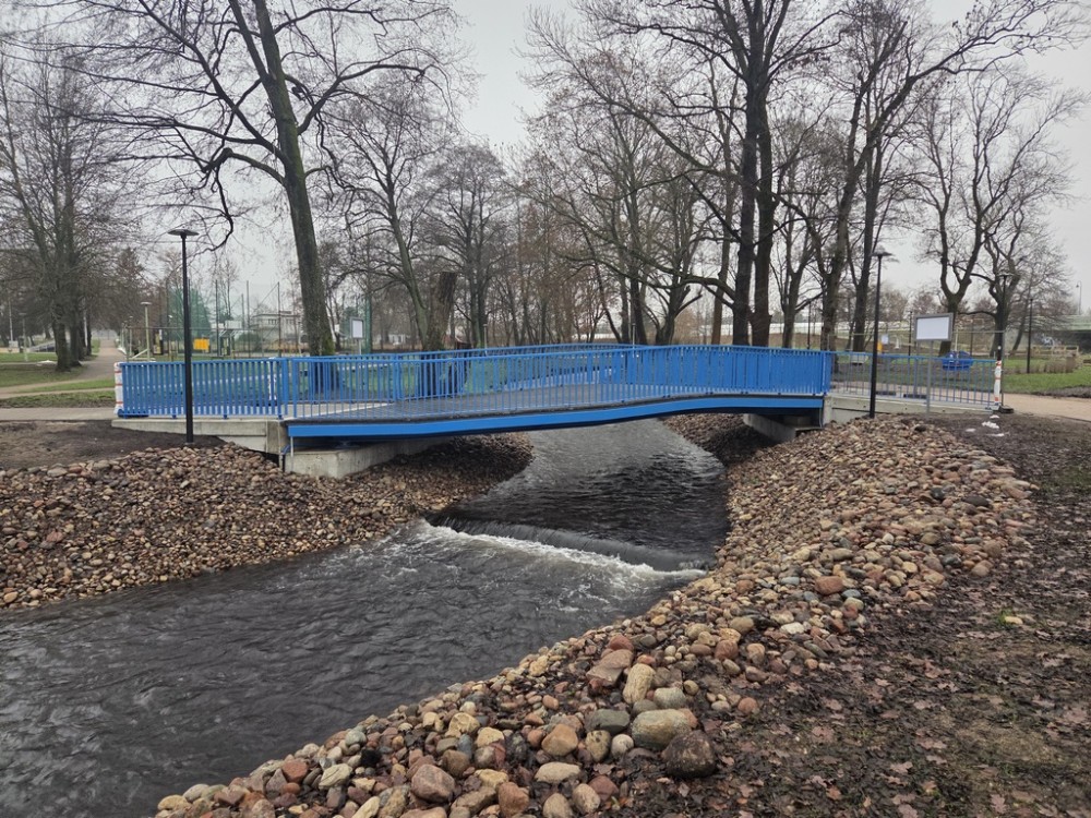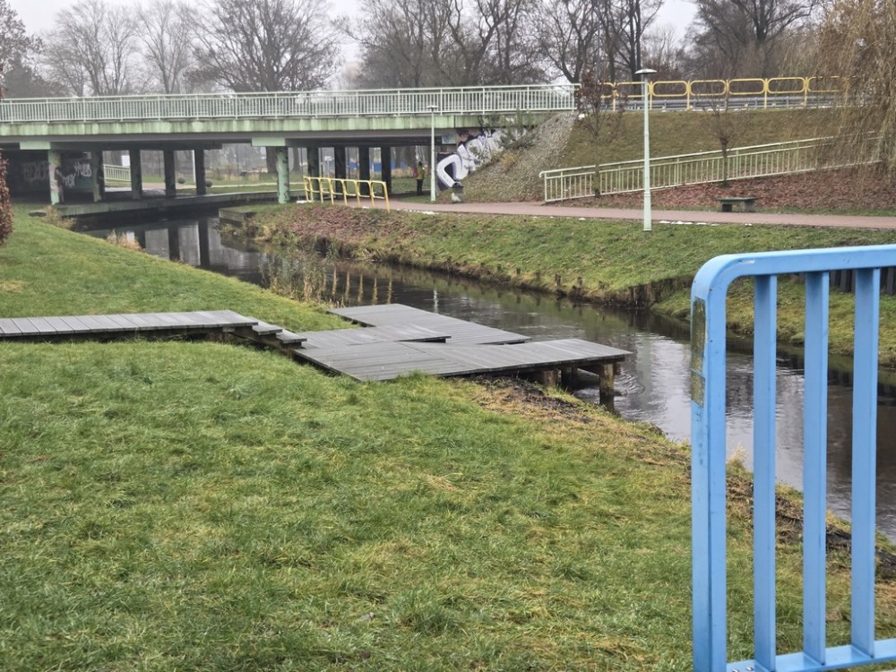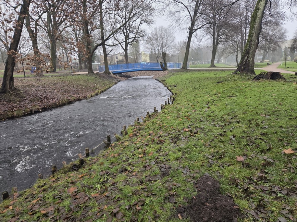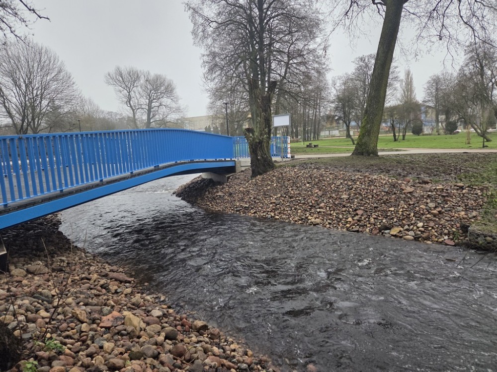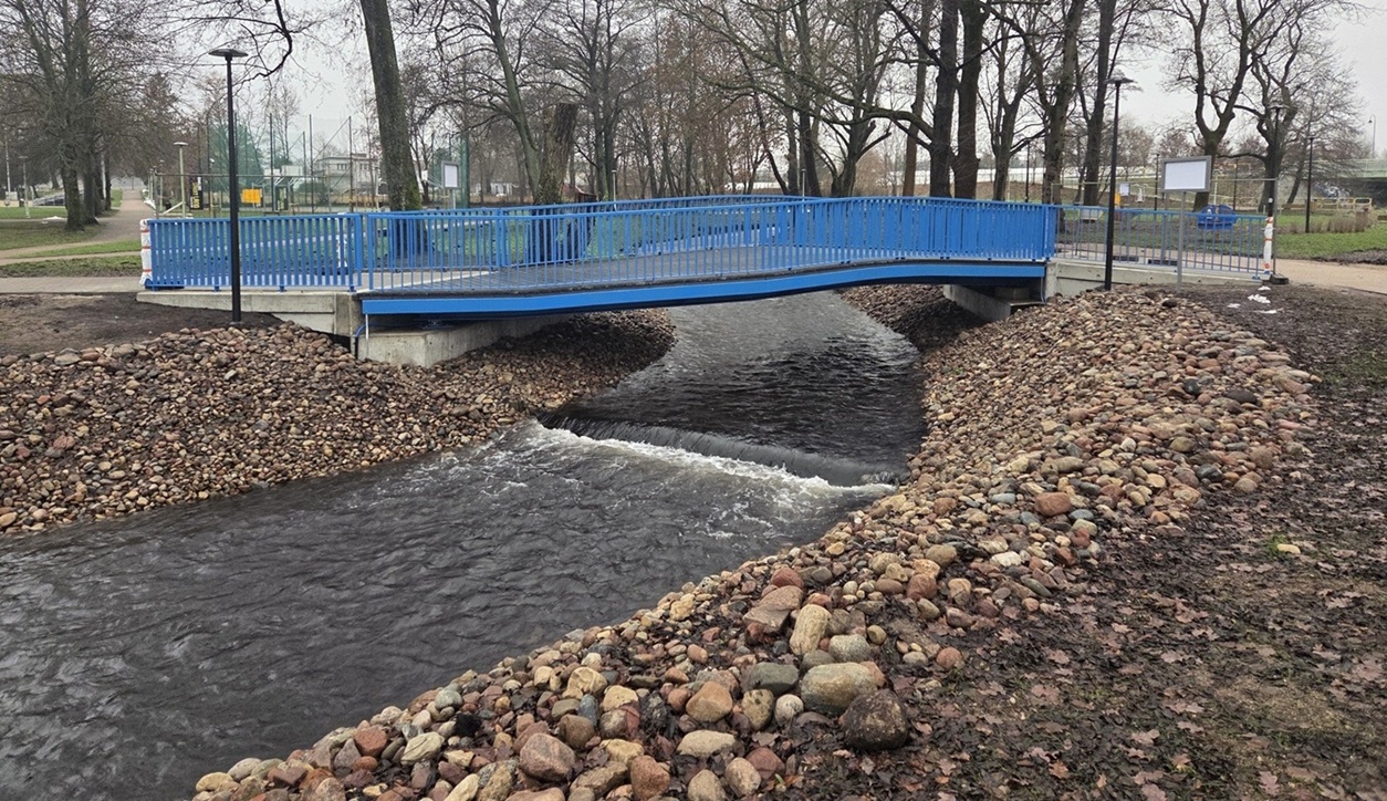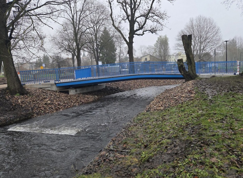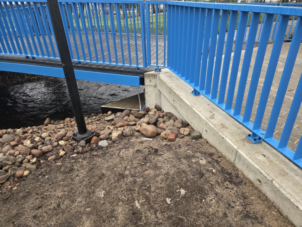 Wrażenie robiły także prace hydrotechniczne. Kamienie do wzmocnienia brzegów przywożono wywrotkami. Kładka ma wszak długość 14,85 metra i szerokość 4,95 metra. Jej nawierzchnia została wykonana z desek kompozytowych drewnopodobnych.