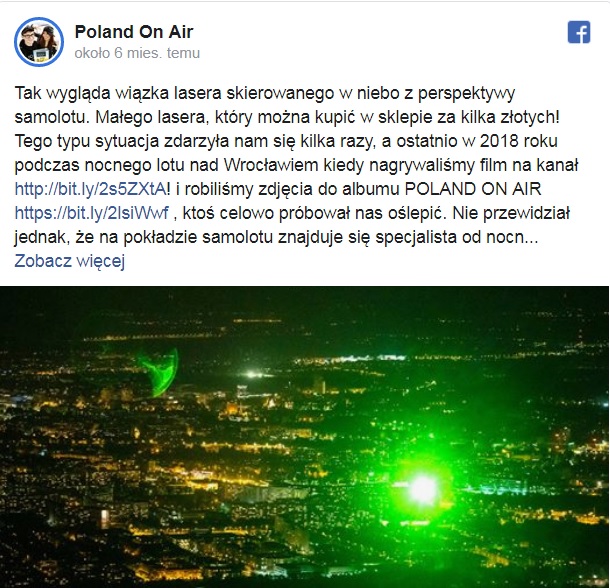 Zgłoszenia dotyczące oślepiania pilotów za pomocą niedużych, ogólnie dostępnych i wyglądających dość niepozornie, ale śmiertelnie niebezpiecznych laserów, pojawiają się kilka, nawet kilkanaście razy w roku. Jak światło lasera wygląda z perspektywy pilota i załogi, można na przykład zobaczyć na fotografiach Macieja Margasa i Aleksandry Łobusz z portalu Poland on Air, którzy przeżyli taką sytuację.