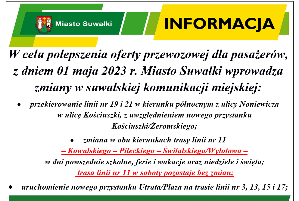 Od 1 maja wprowadzona zostanie zmiana w obu kierunkach trasy linii nr 11 - Kowalskiego – Pileckiego – Åšwitalskiego/Wylotowa – w dni powszednie szkolne, ferie i wakacje oraz niedziele i Å›wiÄ™ta. W soboty trasa linii 11 pozostaje bez zmian.