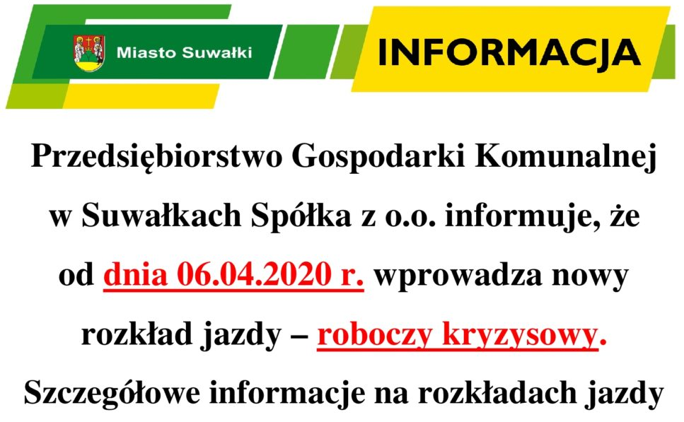 Od poniedziałku, 6 kwietnia Przedsiębiorstwo Gospodarki Komunalnej w Suwałkach wprowadza roboczy kryzysowy rozkład jazdy autobusów komunikacji miejskiej.
