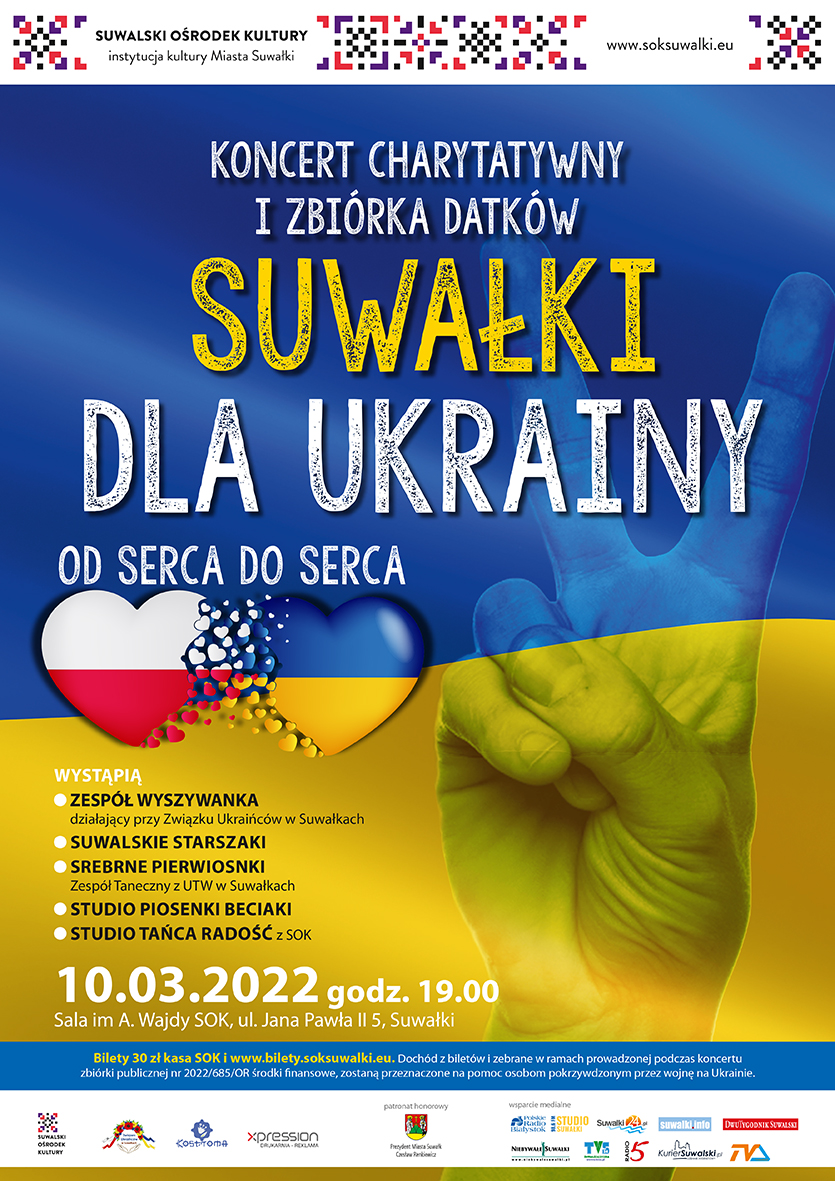 Koncert, organizowany przez Suwalski OÅ›rodek Kultury i ZwiÄ…zek UkraiÅ„ców w SuwaÅ‚kach we wspóÅ‚pracy ze Stowarzyszeniem Kostroma, jest wyrazem solidarnoÅ›ci suwalczan z krzywdzonymi przez wojnÄ™ obywatelami Ukrainy. MieszkaÅ„cy SuwaÅ‚k bardzo aktywnie i zgodnie stanÄ™li po stronie wolnoÅ›ci, cywilizacji życia i praw czÅ‚owieka, wszelkimi dostÄ™pnymi Å›rodkami wspierajÄ…c ukraiÅ„skich sÄ…siadów.