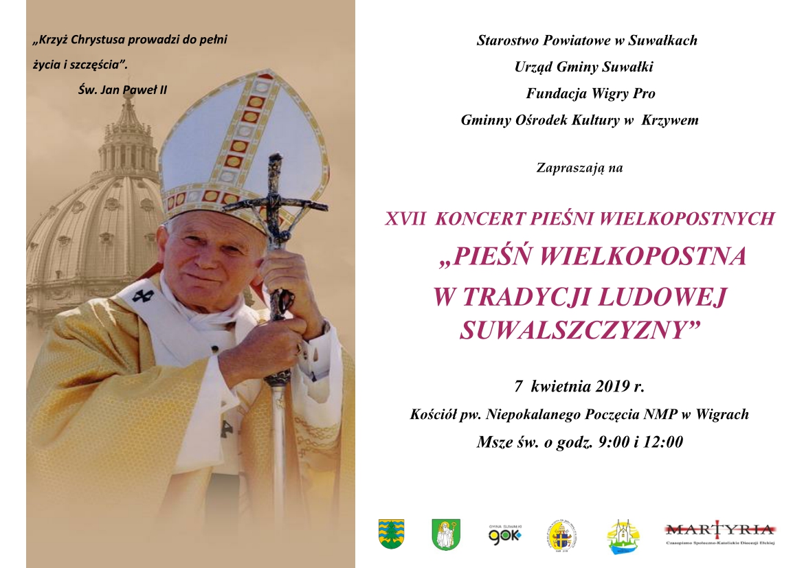 Gminny Ośrodek Kultury w Krzywem serdecznie zaprasza na XVII koncert pieśni wielkopostnych, który odbędzie się w kościele parafialnym w Wigrach 7 kwietnia 2019 r. (niedziela), podczas mszy świętych o godz. 9.00 i 12.00.