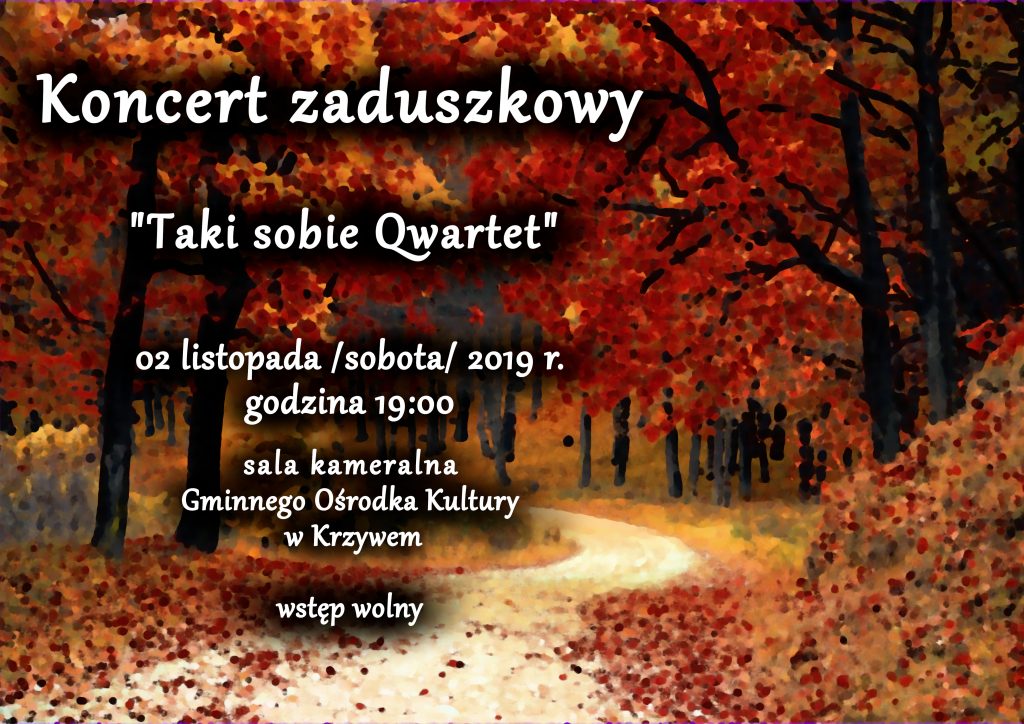 Gminny Ośrodek Kultury w Krzywem serdecznie zaprasza 2 listopada /sobota/ o godzinie 19:00 na pełen nostalgii i zadumy koncert zaduszkowy. Występ będzie miał miejsce na sali kameralnej Gminnego Ośrodka Kultury w Krzywem.