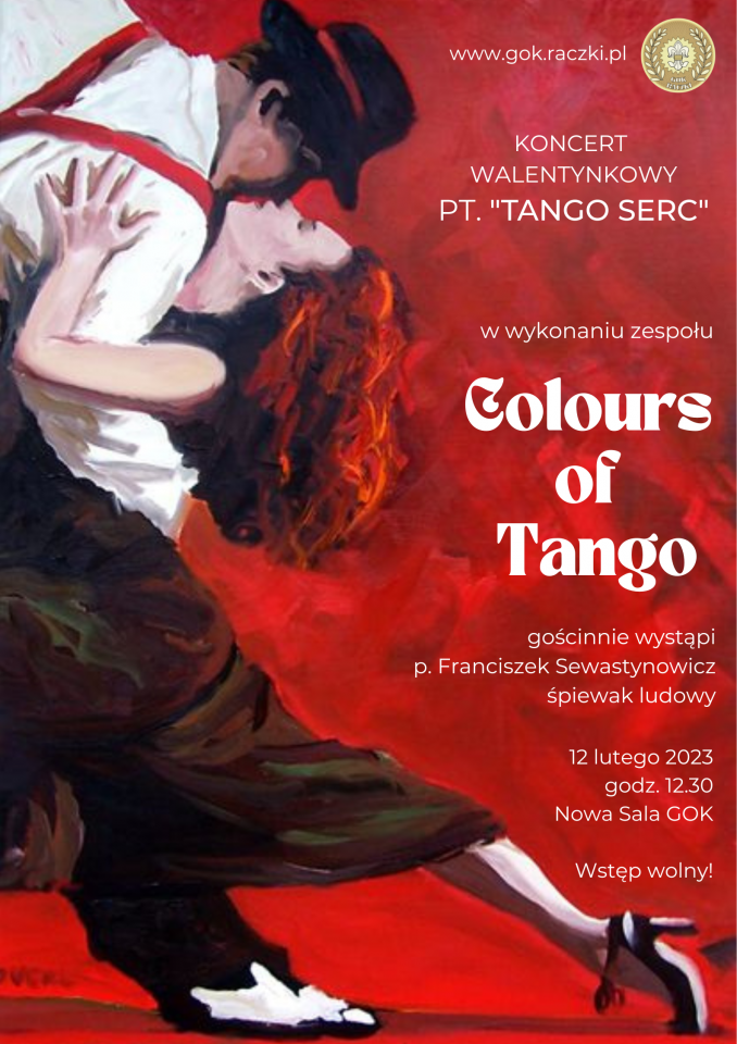 Gminny Ośrodek Kultury w Raczkach zaprasza na koncert zespołu Colours Of Tango, który koncertował już na scenach Polski, Austrii, Niemiec i Wielkiej Brytanii, został także uhonorowany Certyfikatem Academia Nacional del Tango.