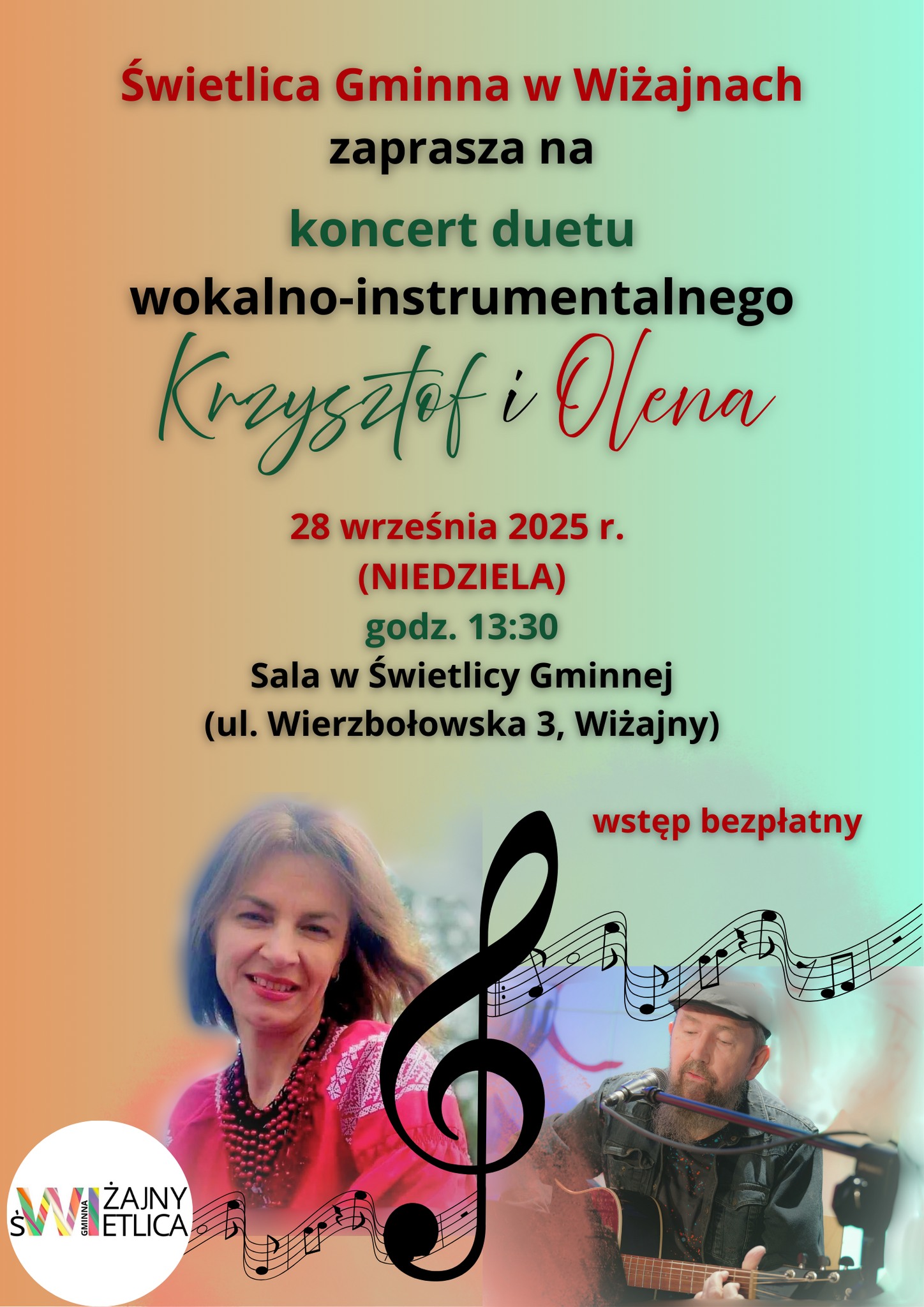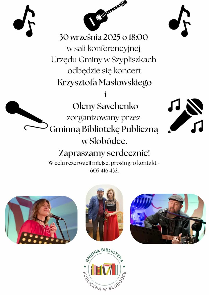 Duet wokalno-instrumentalny Krzysztof i Olena już w ten piÄ…tek, 19 wrzeÅ›nia o godz. 18:00 wystÄ…pi w Gminnej Bibliotece Publicznej w Jeleniewie. Kolejne koncerty zostaÅ‚y zaplanowane na niedzielÄ™, 28 wrzeÅ›nia o godz. 13:30 w Åšwietlicy Gminnej w Wiżajnach oraz na wtorek, 30 wrzeÅ›nia o godz. 18:00 w sali konferencyjnej UrzÄ™du Gminy w Szypliszkach, w której wystÄ™p organizuje Gminna Biblioteka Publiczna w SÅ‚obódce.