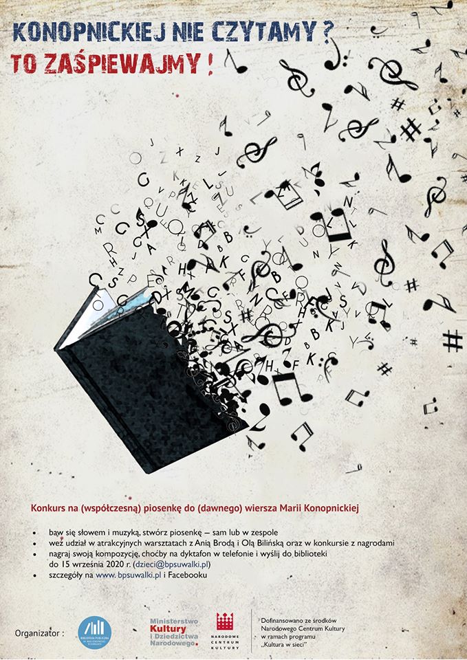 Biblioteka Publiczna im. Marii Konopnickiej w Suwałkach ogłasza projekt „Konopnickiej nie czytamy? To zaśpiewajmy!", a wraz z nim KONKURS NA AUTORSKĄ PIOSENKĘ do wiersza Marii Konopnickiej.