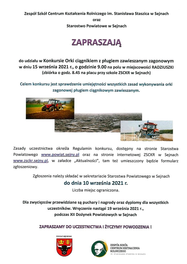 Starostwo Powiatowe w Sejnach oraz Zespół Szkół Kształcenia Rolniczego zapraszają do udziału w konkursie orki. Konkurs odbędzie się 15 września o godz. 9.00 na polu we wsi Radziuszki, koło Sejn. Zbiórka uczestników o 8.45 na placu przy szkole.