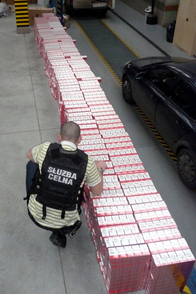 15 tys. paczek nielegalnych papierosów znaleźli funkcjonariusze Służby Celnej z Łomży podczas kontroli dostawczego forda transita. Kontrabanda o szacunkowej wartości rynkowej ponad 150 tys. złotych ukryta była między ładunkiem butów.