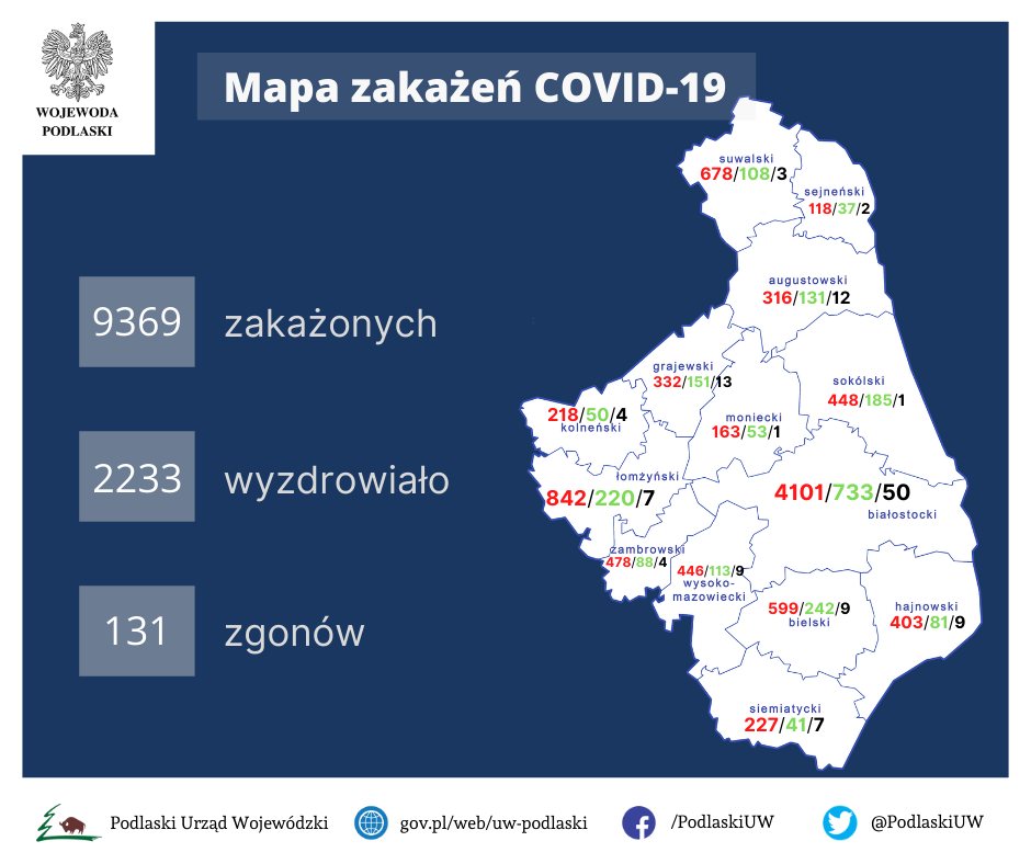 Wojewoda Podlaski i Podlaski Państwowy Wojewódzki Inspektor Sanitarny informują o 644 kolejnych przypadkach zakażenia koronawirusem w regionie, potwierdzonych pozytywnymi wynikami testów laboratoryjnych. Do tej pory łącznie odnotowano 9 369 przypadków w regionie.