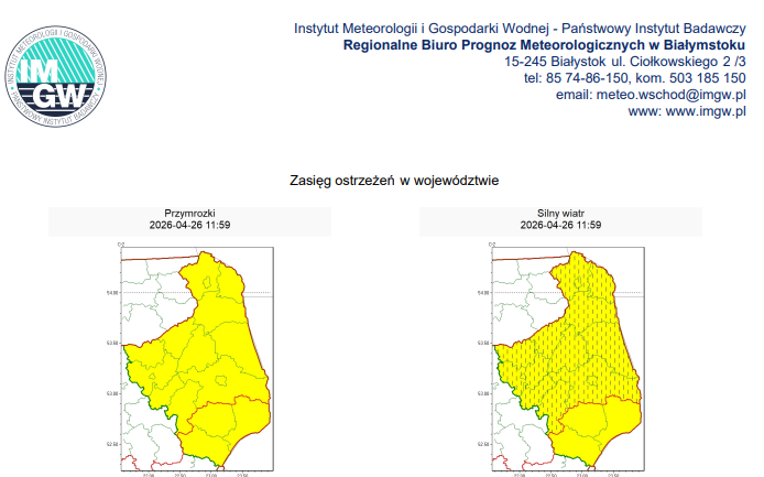 Od godz. 23:00 w niedzielÄ™ do godz. 7:30 w poniedziaÅ‚ek w caÅ‚ym województwie majÄ… wystÄ™pować przymrozki. Prognozowany jest spadek temperatury powietrza do okoÅ‚o -3°C, przy gruncie do okoÅ‚o -6°C.