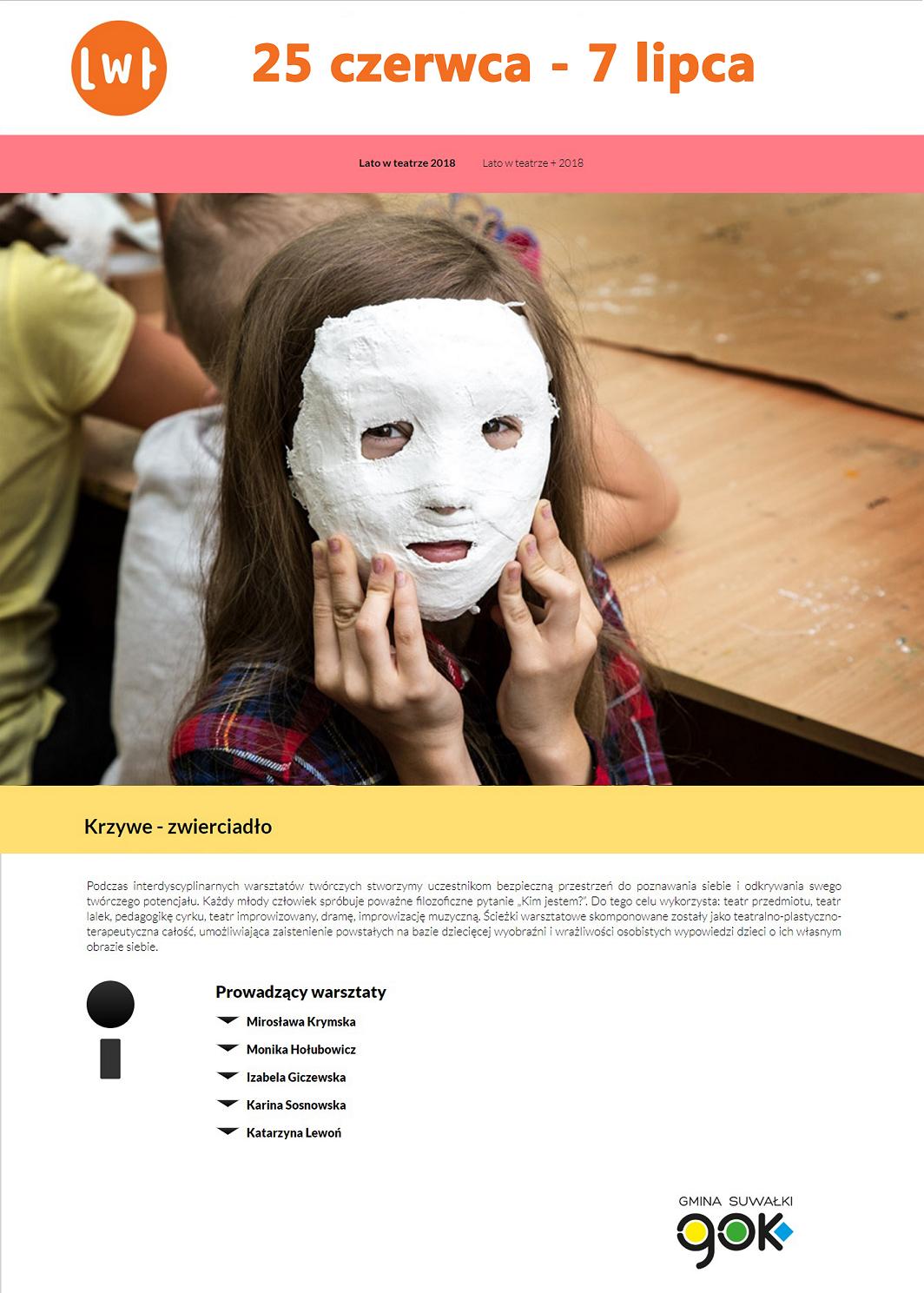 Wystartowały warsztaty teatralne LATO W TEATRZE w Gminnym Ośrodku Kultury w Krzywem pt. „Krzywe – zwierciadło". Będą one trwały od 25 czerwca do 7 lipca. Gminny Ośrodek Kultury w Krzywem już po raz drugi otrzymał dofinansowanie do tych warsztatów, które są rodzajem półkolonii dla dzieci w wieku od 7 do 12 lat. Zajęcia warsztatowe odbywają się codziennie od poniedziałku do soboty w godz. 9:00 – 15:00.