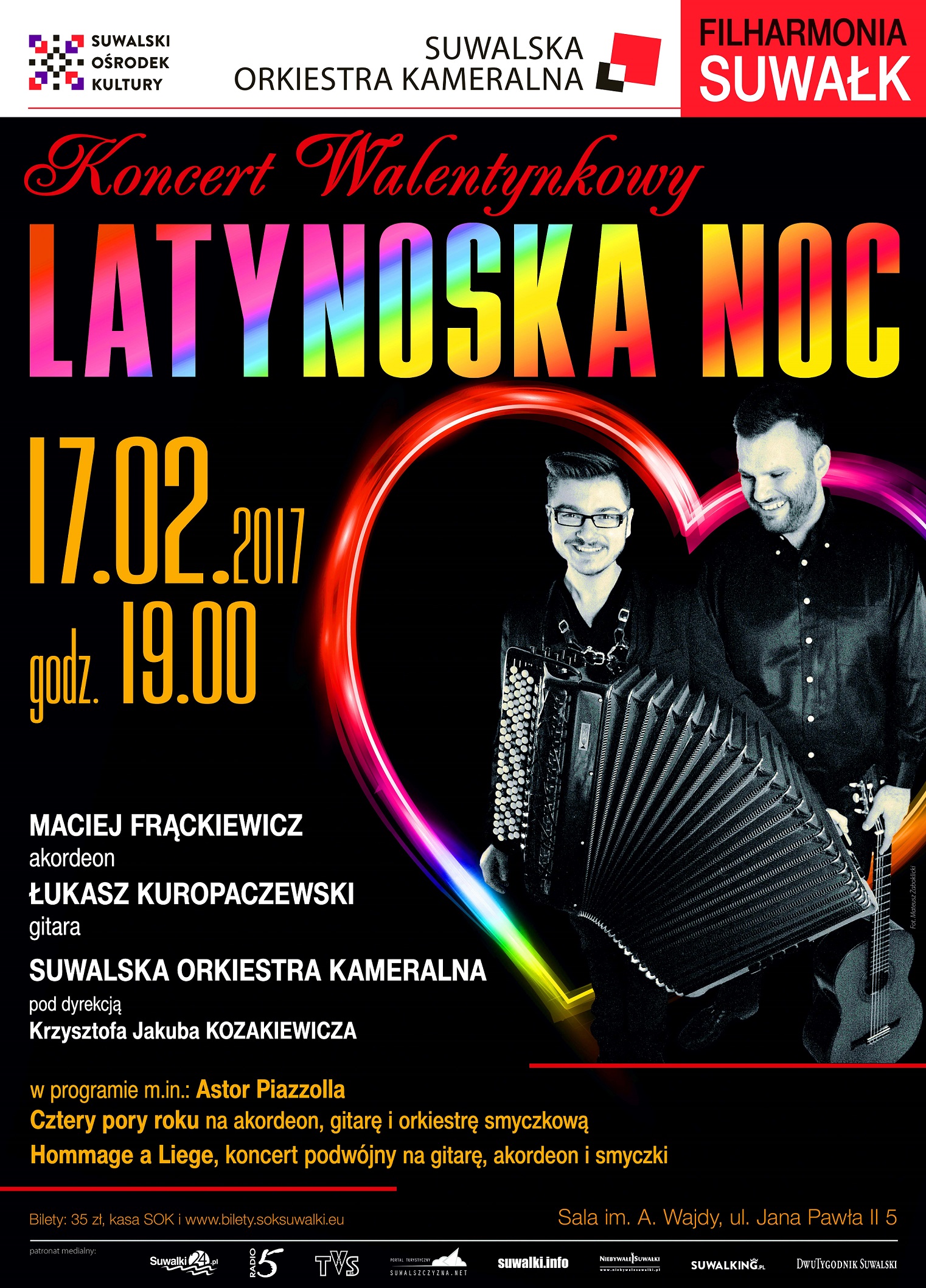 Zarówno nazwiska wykonawców jak i repertuar zapowiadają wyjątkowe wydarzenie artystyczne. Trzon programu, przygotowanego przez czołowych polskich instrumentalistów wirtuozów, specjalizujących się w wykonaniach muzyki hiszpańskiej, argentyńskiej i afro-kubańskiej – akordeonisty Macieja Frąckiewicza i gitarzysty Łukasza Kuropaczewskiego, stanowią utwory nawiązujące do tych tradycji, form i rytmów tanecznych – dzieła Astora Piazzolli utrzymane w charakterystycznym stylu Tango Nuevo. Solistom towarzyszyć będzie Suwalska Orkiestra Kameralna pod dyrekcją Krzysztofa Jakuba Kozakiewicza.