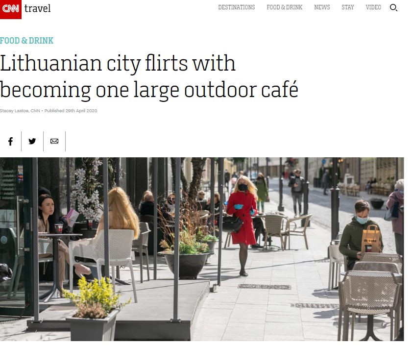 Czy widzieliście kiedyś kawiarnię na świeżym powietrzu rozrzuconą po całym mieście? – pytają i odpowiadają: „ Można je zobaczyć w Wilnie, zwłaszcza gdy miasto deklaruje, że robi krok dalej, pomagając kawiarniom i restauracjom, które zostały ponownie otwarte w tym tygodniu w ramach stopniowego wyjścia Litwy z blokady koronawirusa. Wileńskie przestrzenie publiczne - które do tej pory rzadko były wykorzystywane do spożywania posiłków na świeżym powietrzu, takie jak słynny Plac Katedralny w mieście - są teraz otwarte na tę działalność, aby wesprzeć miejskie restauracje w trudnych czasach. Ogłoszenie spotkało się z entuzjazmem zarówno ze strony właścicieli kawiarni, jak i mieszkańców Wilna, którzy pragną wrócić do swoich ulubionych kawiarni po tygodniach pozostania w domach”.