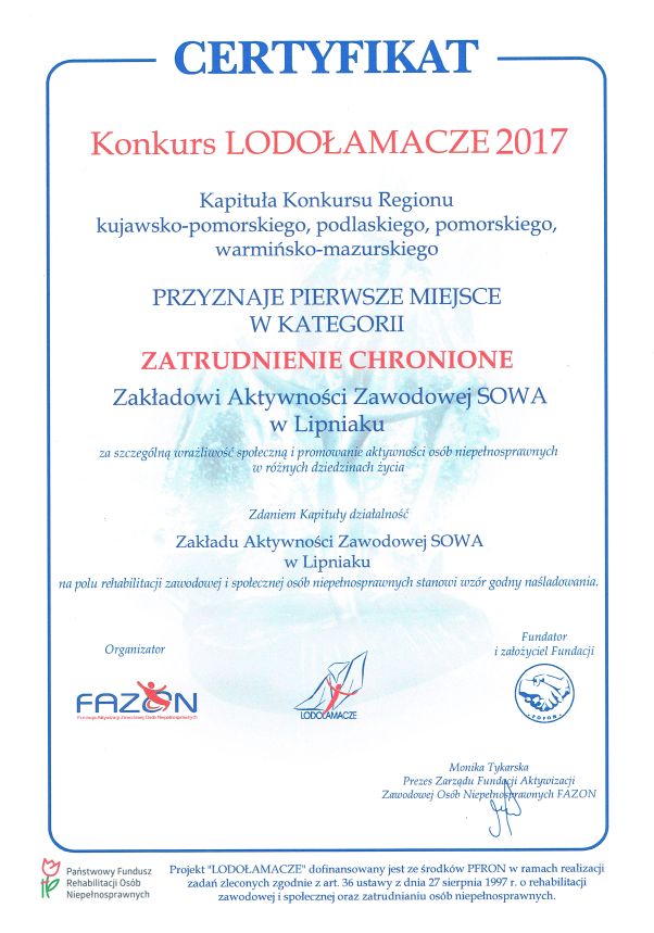 Zakład Aktywności Zawodowej SOWA w Lipniaku zdobywcą I miejsca w kategorii w „Zakłady pracy chronionej” w Kujawsko-Pomorskiej, Podlaskiej, Pomorskiej, Warmińsko-Mazurskiej Regionalnej XII Edycji Konkursu LODOŁAMACZE 2017. Uroczysta gala połączona z wręczeniem nagród odbyła się w Gdańsku.
