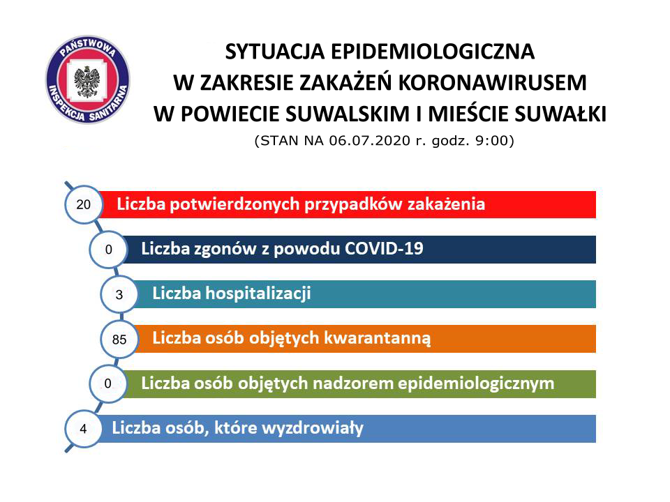 Powiatowa Stacja Sanitarno-Epidemiologiczna w Suwałkach, obejmująca miasto i powiat suwalski, odnotowała 20. od początku epidemii przypadek zakażenia koronawirusem.