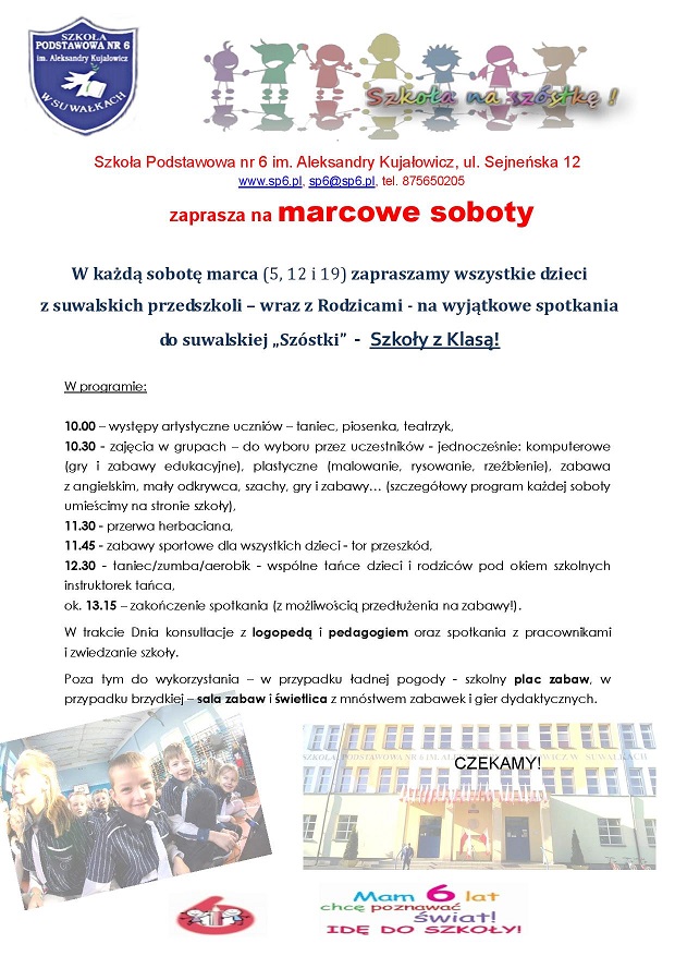Szkoła Podstawowa nr 6 im. Aleksandry Kujałowicz w Suwałkach zaprasza na marcowe soboty. W każdą sobotę marca – 5, 12 i 19, wszystkie dzieci z suwalskich przedszkoli będą mogły wraz z rodzicami wziąć udział w wielu zajęciach, m.in.: komputerowych, plastycznych, z językiem angielskim, sportowych.