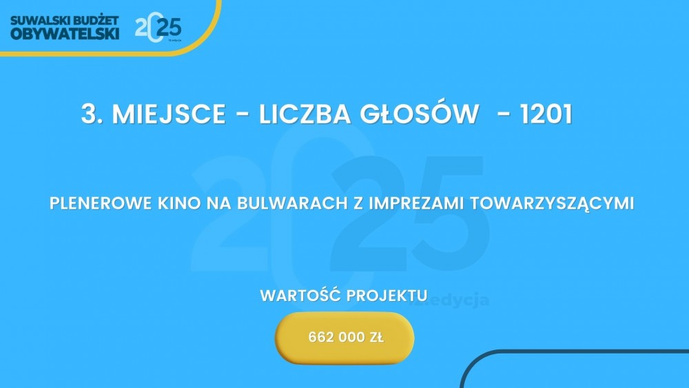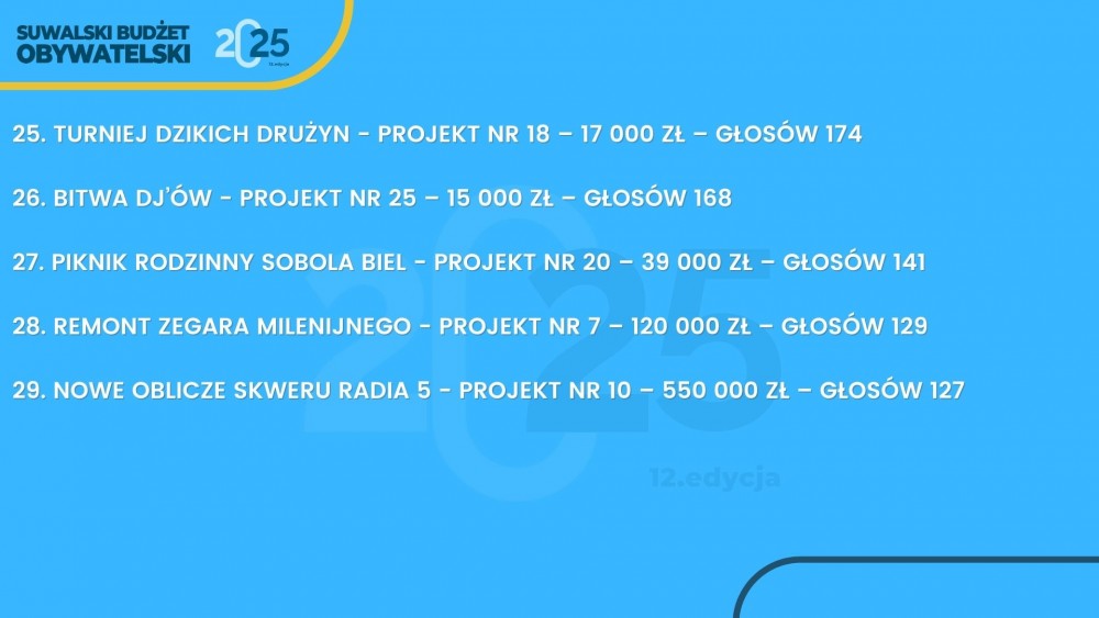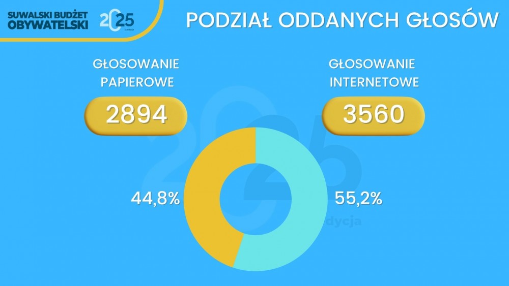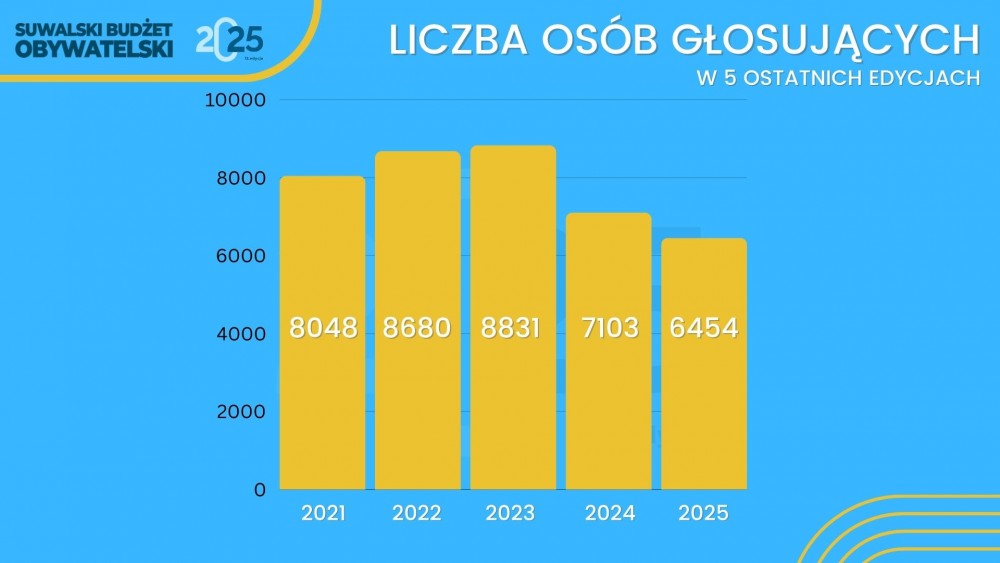 Dzisiaj poznaliÅ›my wyniki gÅ‚osowania na 29 projektów zakwalifikowanych do Suwalskiego Budżetu Obywatelskiego 2025. Martwi frekwencja, spada zainteresowanie suwalczan. Oddano 6 454 ważnych kart. To o 10 proc. mniej niż przed rokiem. To akurat można wytÅ‚umaczyć tym, że czas gÅ‚osowania przypadÅ‚ na poczÄ…tek wakacji, czyli trzeba jeszcze bardziej przyspieszyć wszystkie procedury.