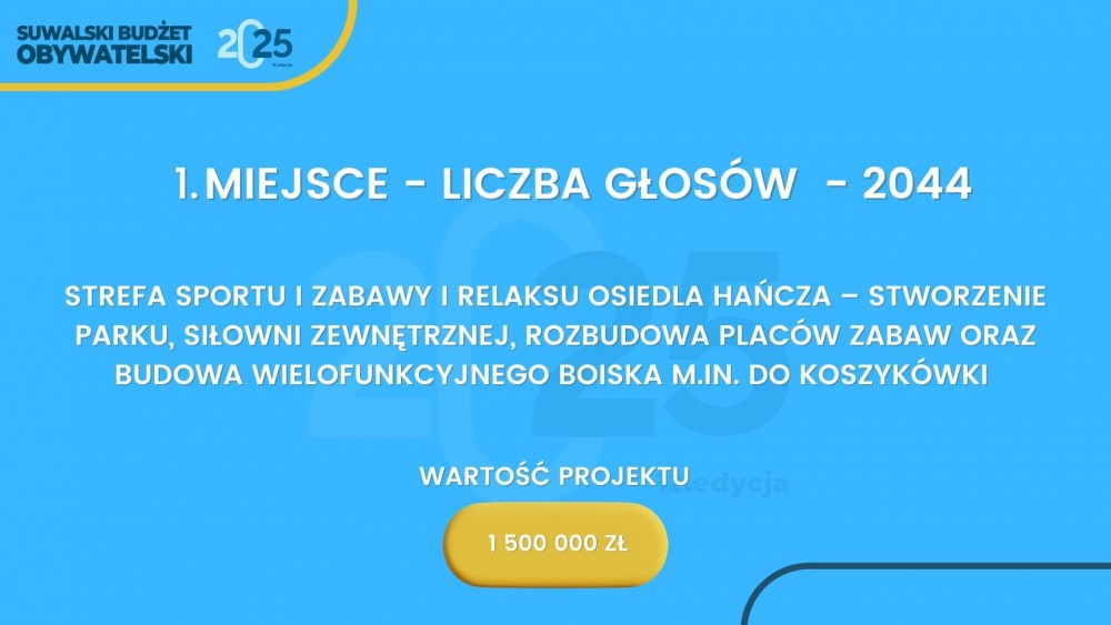 1. Strefa sportu i zabawy i relaksu osiedla HaÅ„cza – stworzenie parku, siÅ‚owni zewnÄ™trznej, rozbudowa placów zabaw oraz budowa wielofunkcyjnego boiska m.in. do koszykówki - 1 500 000,00 zÅ‚ – gÅ‚osów 2044
