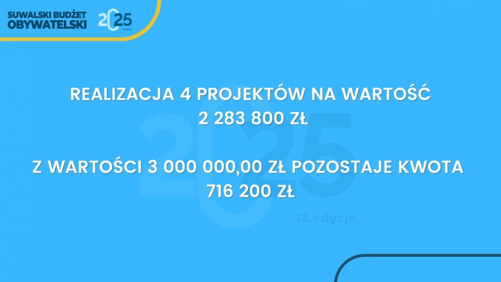 Wiemy, jakie cztery przedsięwzięcia zostaną zrealizowane z wynoszącego 3 mln zł Suwalskiego Budżetu Obywatelskiego na 2025 rok. Piąta inwestycja będzie znana trochę później.