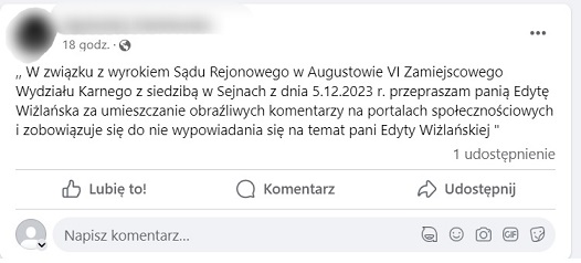 Sprawa swój finaÅ‚ znalazÅ‚a w sejneÅ„skim sÄ…dzie. Zgodnie z wyrokiem sÄ…du kobieta, która pomówiÅ‚a policjantkÄ™, zostaÅ‚a uznana za winnÄ… i musiaÅ‚a przeprosić, publikujÄ…c oÅ›wiadczenie.