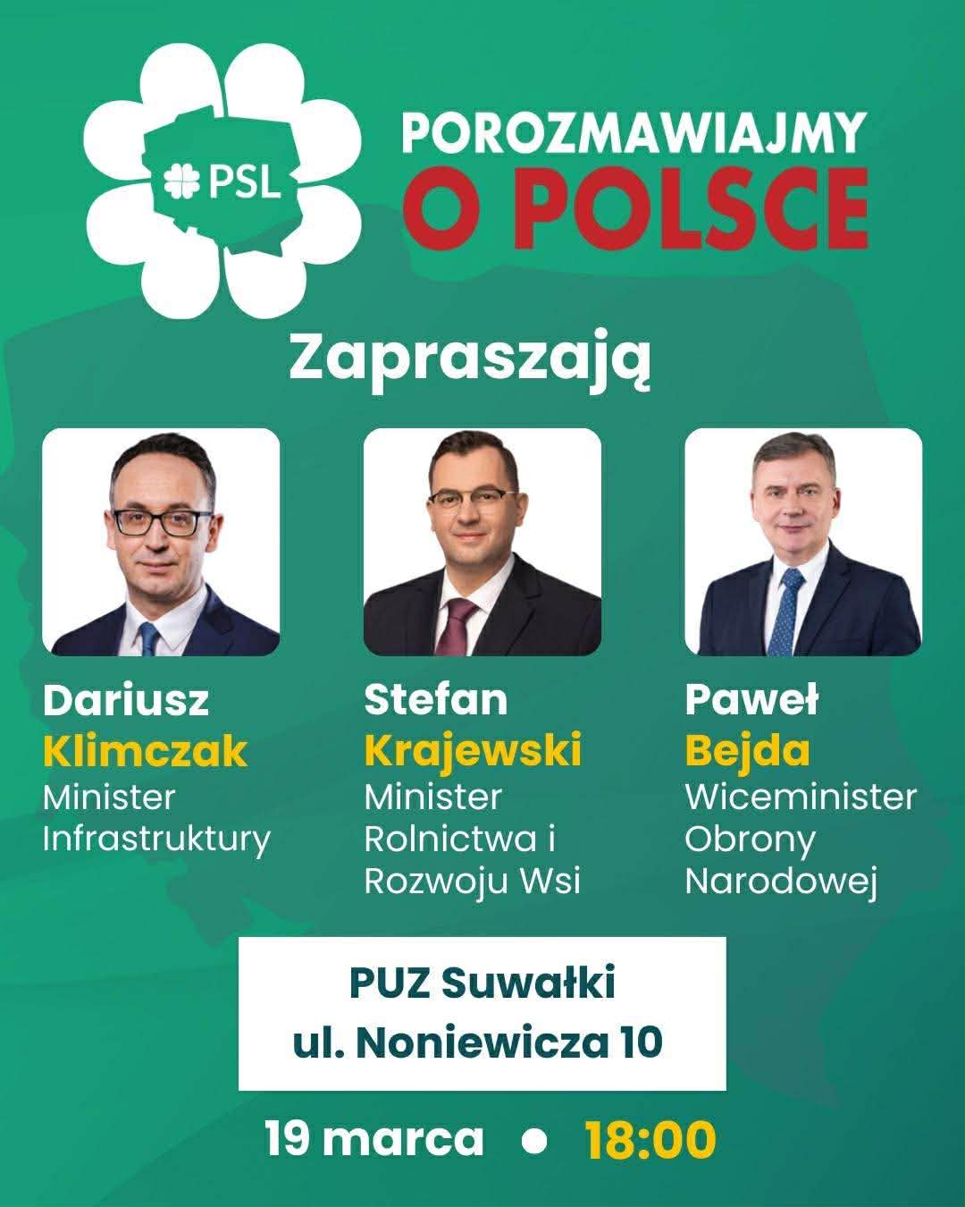 Polskie Stronnictwo Ludowe zaprasza mieszkańców Suwałk i regionu na otwarte spotkanie z przedstawicielami rządu RP, które odbędzie się w najbliższy czwartek, 19 marca o godz. 18:00 w Państwowej Uczelni Zawodowej w Suwałkach przy ul. Noniewicza 10.