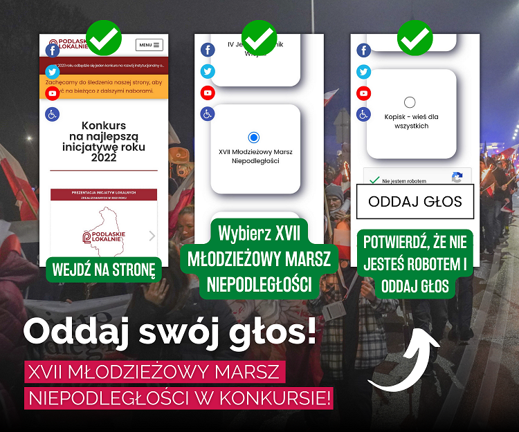 - Zwracamy się z uprzejmą prośbą do Suwalczan oraz Mieszkańców całego regionu o oddanie głosu na XVII Młodzieżowy Marsz Niepodległości, który dzięki Nim może zostać Najlepszą Inicjatywą Lokalną 2022 Roku - apelują organizatorzy. - Oddanie głosu nie wymaga weryfikacji, ani zatwierdzenia mailowego i zajmuje około 15 sekund. Internetowe głosowanie trwa tylko do niedzieli (11 grudnia 2022) do godz. 23:59. .
