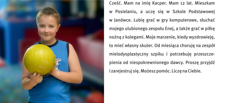 Kacper ma 12 lat. Mieszka w Posielaniu, a uczy się w Szkole Podstawowej w Janówce. Lubi grać w gry komputerowe i piłkę nożną oraz słuchać zespołu Enej. Kiedy wyzdrowieje, chciałby mieć swój własny skuter. Miesiąc temu został u niego zdiagnozowany zespół mielodysplastyczny i obecnie potrzebuje przeszczepienia od dawcy niespokrewnionego. Aby pomóc jemu oraz innym pacjentom, rodzina i przyjaciele wspólnie z Fundacją DKMS Polska organizują akcję rejestracji potencjalnych dawców szpiku.