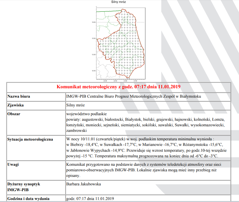 Polarne powietrze napÅ‚ynęło do nas w czwartek po poÅ‚udniu. O godzinie 17.00 najniższa temperatura zostaÅ‚a zanotowana w SuwaÅ‚kach -16,3°C, w Biebrzy -16,2°C, JabÅ‚onowo-Wypychy -15,2°C i w Różanymstoku -14,1°C.
