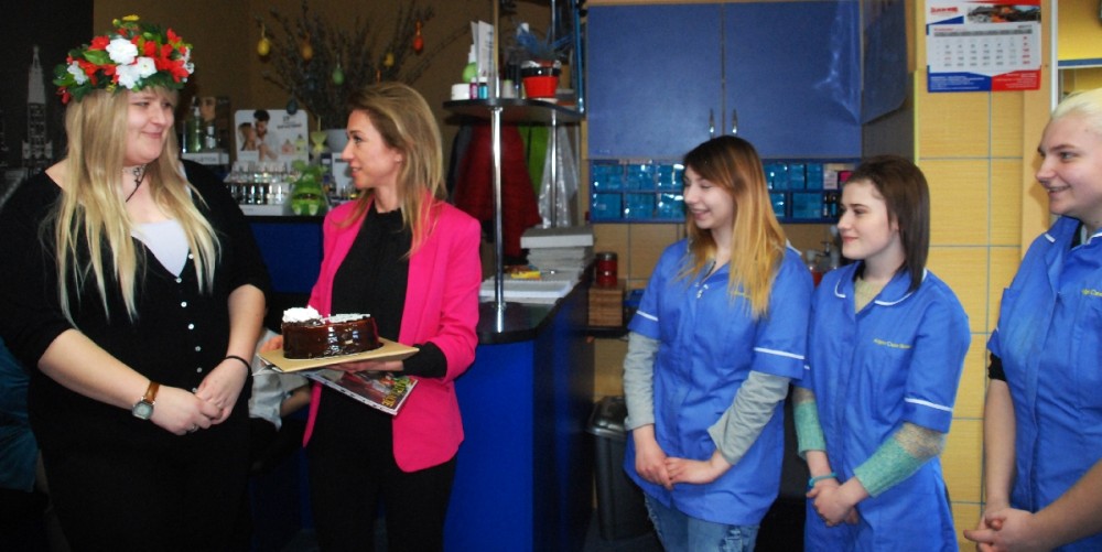 Jak informowaliśmy w poniedziałek, suwalczanka Oliwia Chrościelewska wygrała wojewódzki etap konkursu fryzjerskiego „Sprawny w zawodzie, bezpieczny w pracy”. Dziś w salonie, w którym pracuje, wręczono jej słodką niespodziankę.