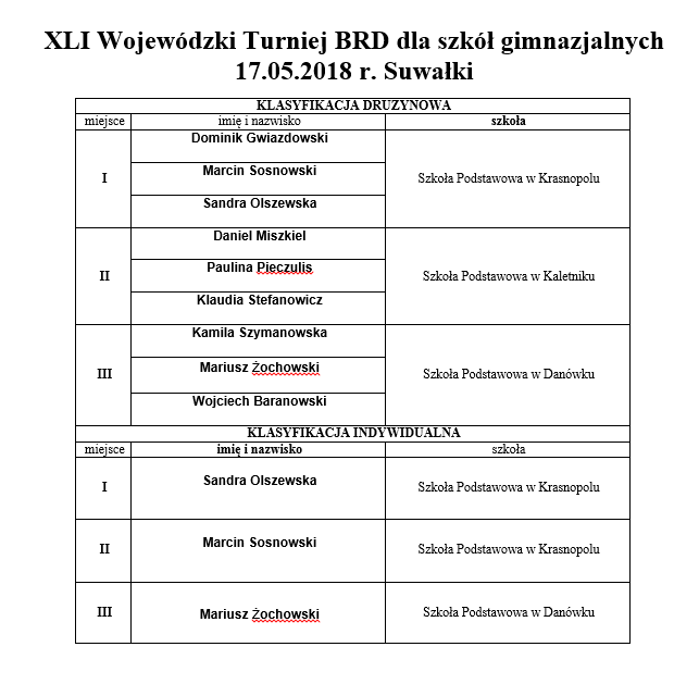Zakończył się tegoroczny 41. Wojewódzki Turniej BRD dla gimnazjów. W klasyfikacji drużynowej zwyciężył zespół reprezentujący Szkołę Podstawową w Krasnopolu. Z kolei indywidualnie najlepszym zawodnikiem tej niecodziennej rywalizacji okazała się uczennica tej samej placówki – Sandra Olszewska.