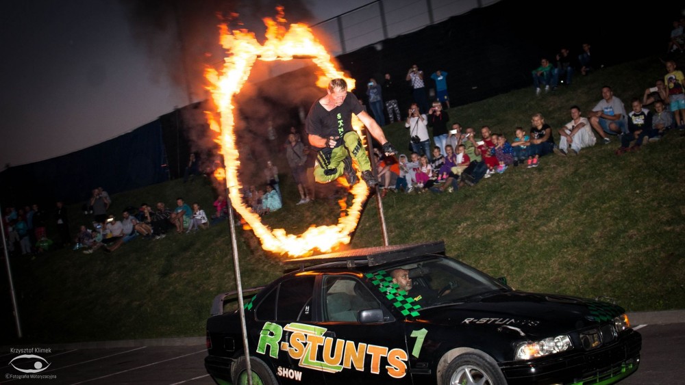 * przejazd przez ścianę ognia z człowiekiem na masce pojazdu;