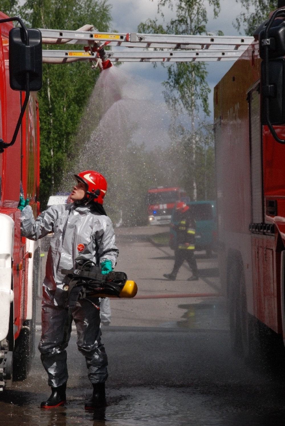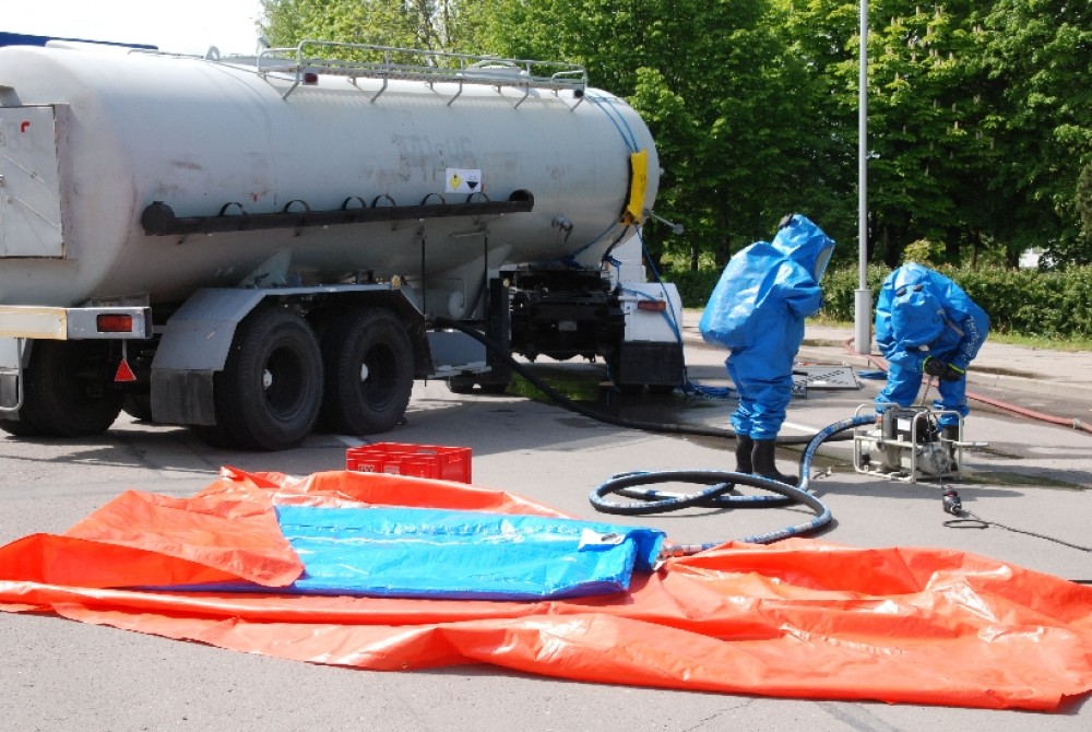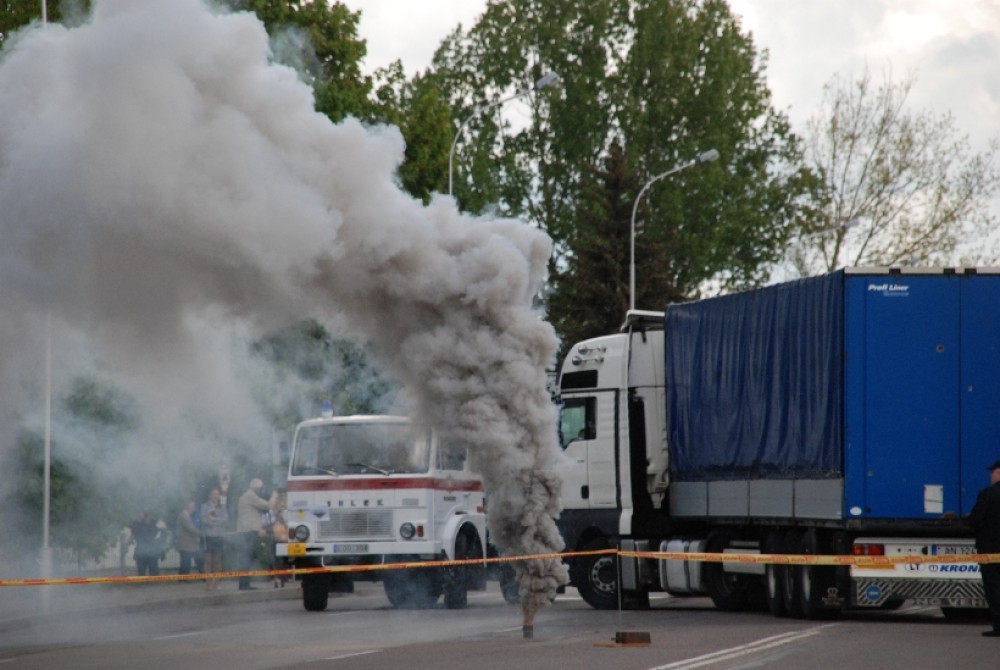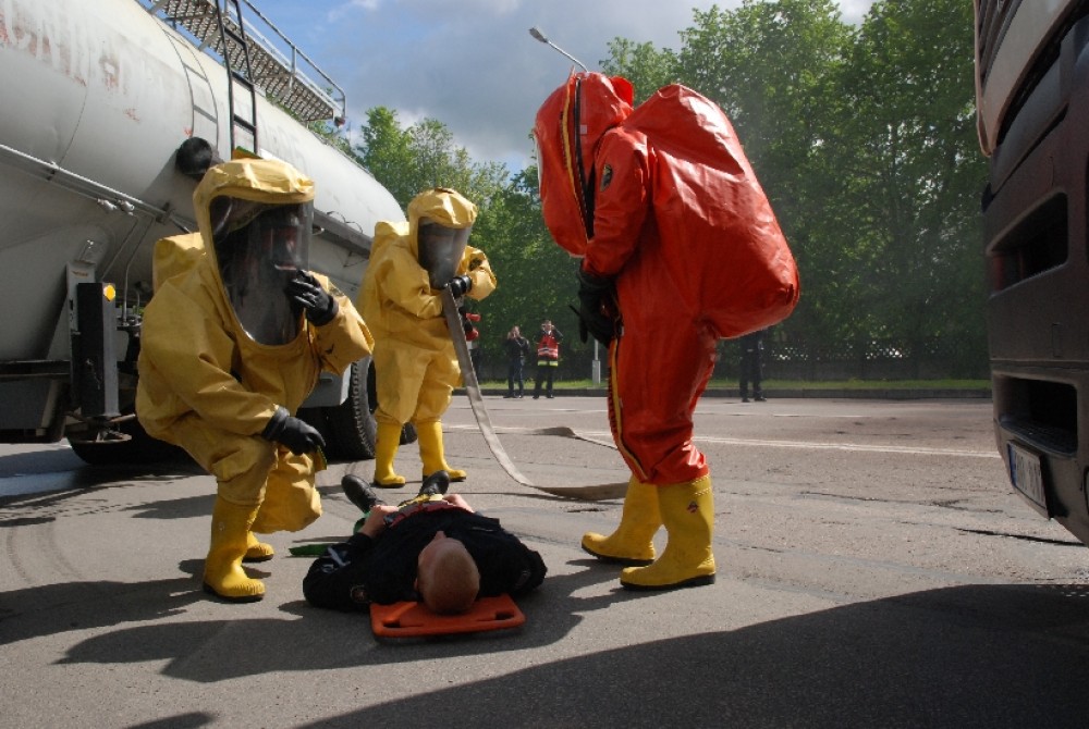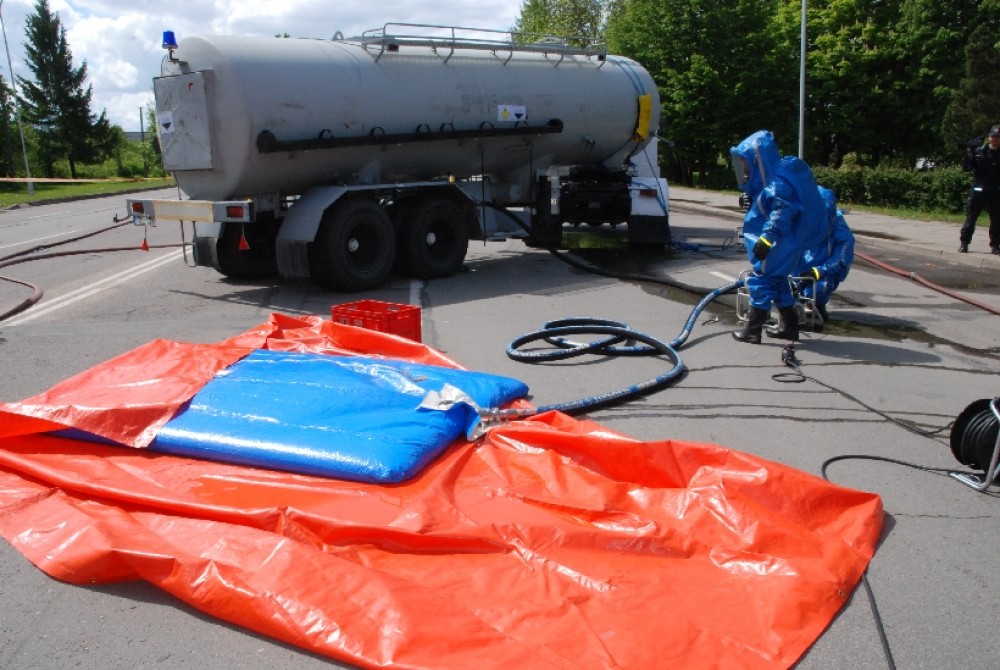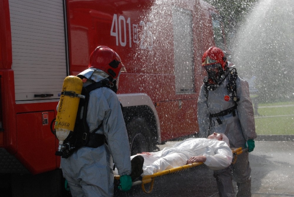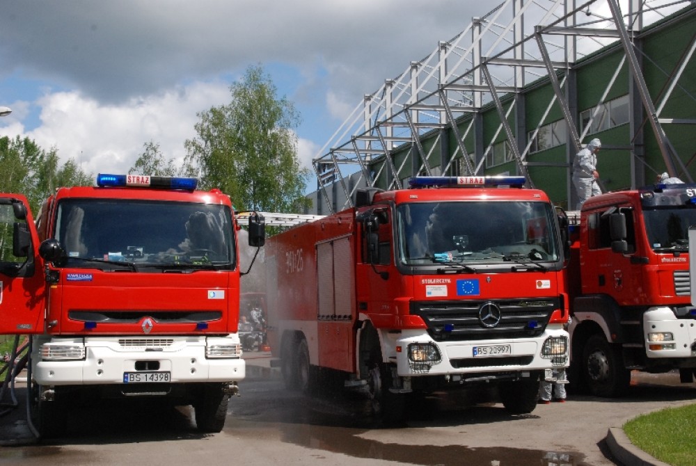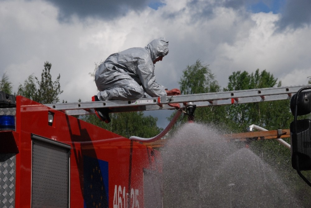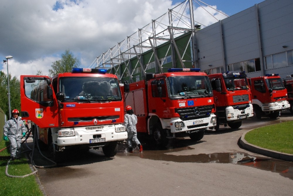 - W wyniku panujÄ…cych warunków drogowych dochodzÅ‚o do zderzenia samochodu ciężarowego, przewożącego meble, z cysternÄ…, w której znajdowaÅ‚ siÄ™ stężony nadtlenek wodoru – zaÅ‚ożenia ćwiczeÅ„ przedstawia st. kpt. Marcin Janowski, rzecznik prasowy KW PSP w BiaÅ‚ymstoku. - Obaj kierowcy zostali uwiÄ™zieni w pojazdach i byli nieprzytomni. Dodatkowo w ciężarówce doszÅ‚o do pożaru, którego objÄ…Å‚ też przewożony Å‚adunek. Z uszkodzeniem pÅ‚aszcza cysterny na drogÄ™ zaczęła wyciekać niebezpieczna substancja, której opary zagrażaÅ‚y Centrum Sportowemu.