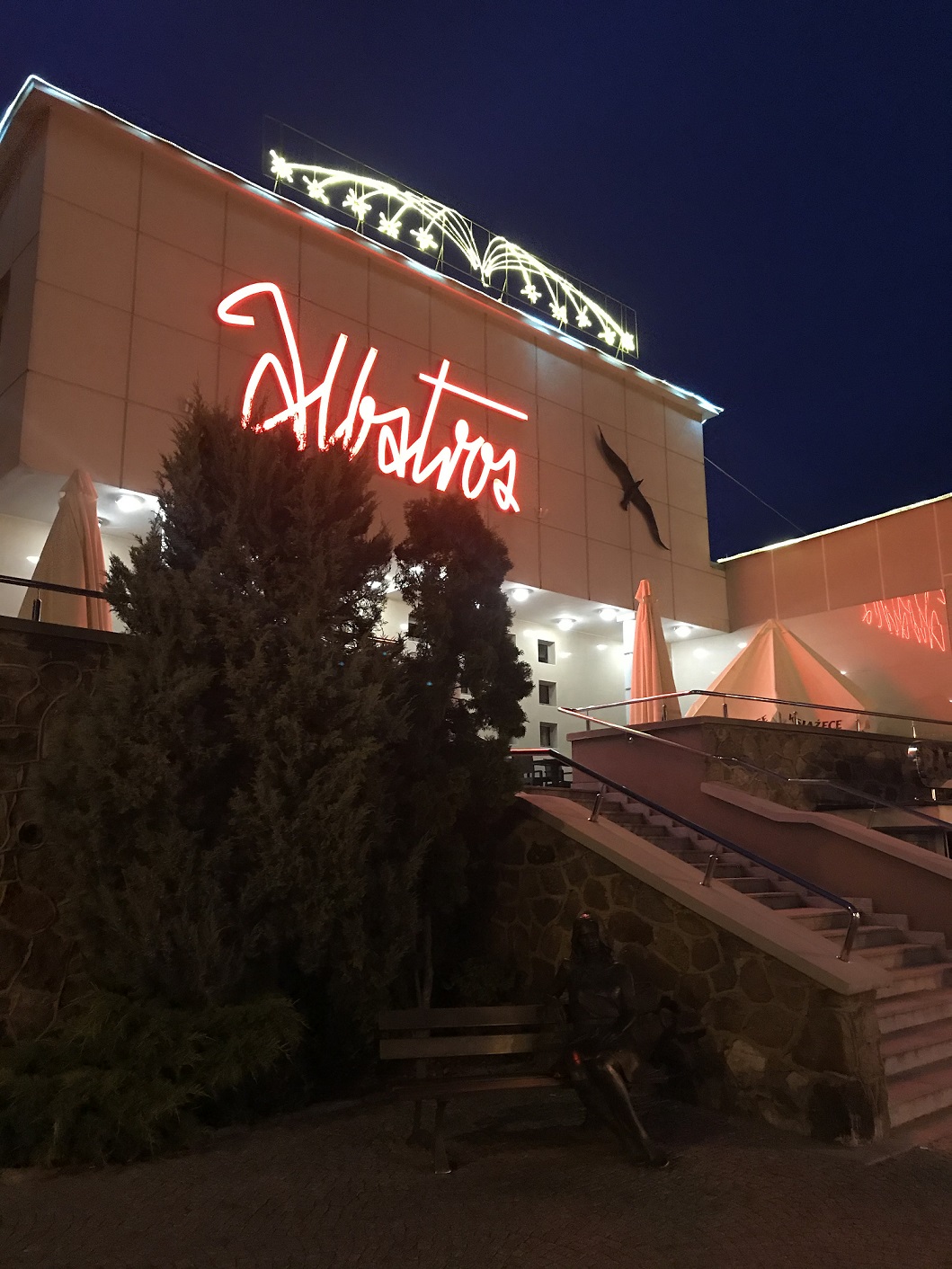 Neon znajduje siÄ™ na poÅ‚udniowo-wschodniej elewacji budynku przy ul. Mostowej 3 w Augustowie. Ma formÄ™ stylizowanego napisu "Albatros", bÄ™dÄ…cego jednoczeÅ›nie nazwÄ… funkcjonujÄ…cej tam restauracji. "Neon ma formÄ™ przestrzennego, metalowego napisu malowanego od frontu na biaÅ‚o, z kolei po bokach - na kolor srebrny. Czcionka wyrazu jest stylizowana zamaszyÅ›cie nakreÅ›lonÄ… pierwszÄ… literÄ… "A", pÅ‚ynnie łączÄ…cÄ… siÄ™ z kolejnymi literami szyldu." - prof. MaÅ‚gorzata Dajnowicz, podlaska konserwator zabytków. Zastosowane w neonie rurki wykonane sÄ… z przezroczystego szkÅ‚a oraz wypeÅ‚nione gazem szlachetnym - neonem, któremu zawdziÄ™cza swojÄ… czerwonÄ… barwÄ™ po rozÅ›wietleniu.