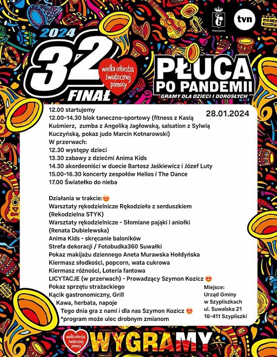 W SuwaÅ‚kach finaÅ‚ WOÅšP organizowany jest razem z OÅ›rodkiem Sportu i Rekreacji w SuwaÅ‚kach oraz Suwalskim OÅ›rodkiem Kultury. Od godziny 10.00 do 21.00 w Arenie SuwaÅ‚ki odbywać siÄ™ bÄ™dÄ… wystÄ™py artystyczne zespoÅ‚ów, grup mÅ‚odzieżowych, animacje, pokazy. BÄ™dzie można pograć w badmintona, gry planszowe, wziąć udziaÅ‚ w treningu Jiu Jitsu, pchlim targu, obejrzeć stoiska sÅ‚użb mundurowych, a nawet wylicytować zwiedzanie aresztu Å›ledczego. WiÄ™cej informacji: 32. FinaÅ‚ WOÅšP w SuwaÅ‚kach. W programie mnóstwo atrakcji i ciekawych licytacji