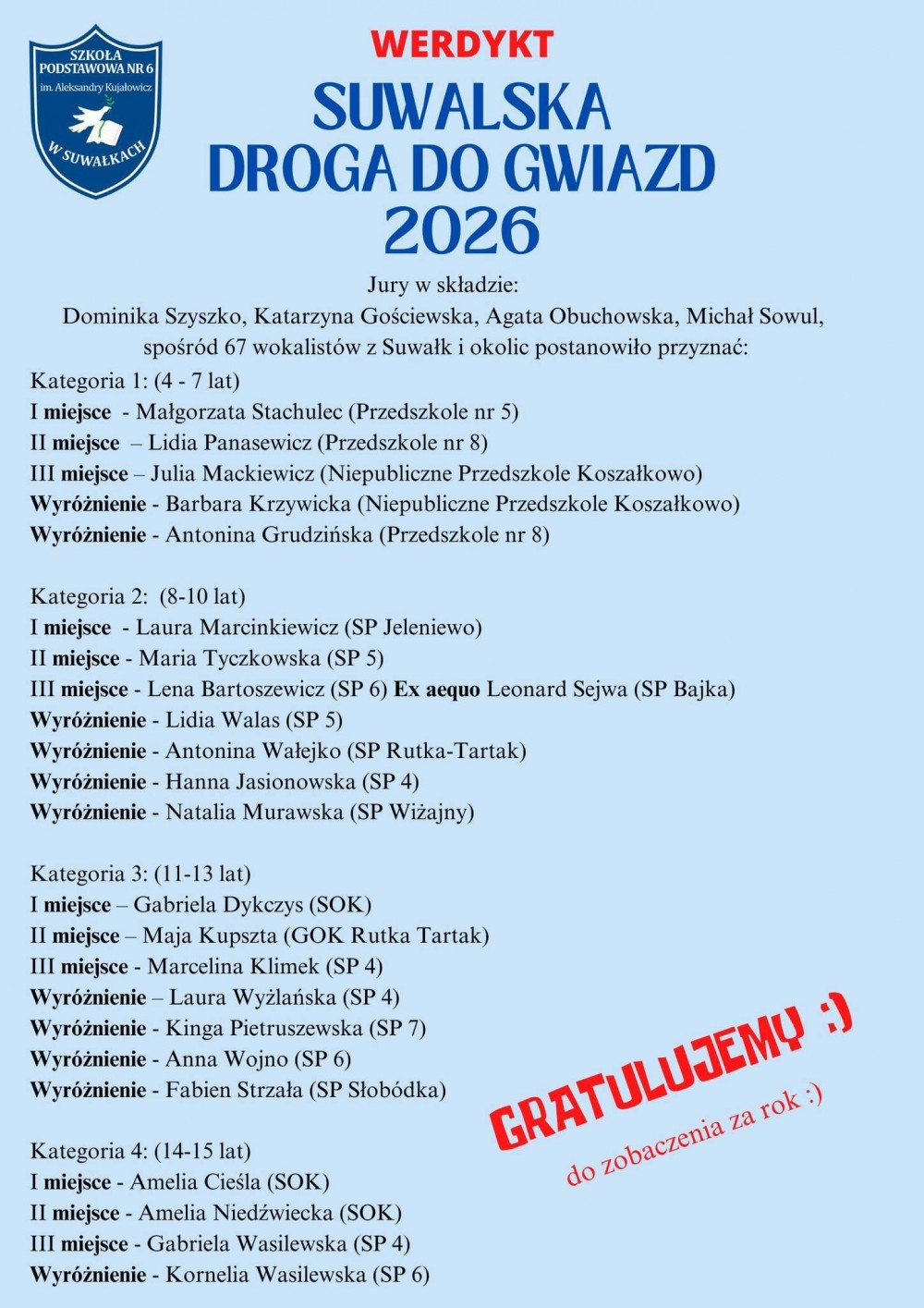 Jury w składzie: Katarzyna Gościewska, Dominika Szyszko, Agata Obuchowska i Michał Sowul, postanowiło przyznać pierwsze miejsca Małgorzacie Stachulec (Przedszkole nr 5 w Suwałkach), Laurze Marcinkiewicz (Szkoła Podstawowa w Jeleniewie), Gabrieli Dykczys ( Suwalski Ośrodek Kultury) oraz Amelii Cieśli ( Suwalski Ośrodek Kultury).