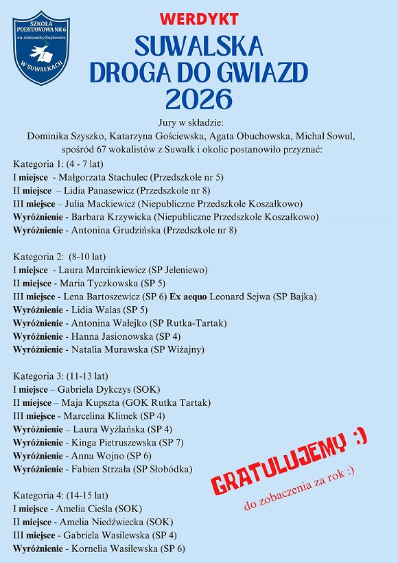 Już po raz 26. w Szkole Podstawowej nr 6 im. A. Kujałowicz w Suwałkach odbył się konkurs piosenki „Suwalska Droga do Gwiazd”. Wzięło w nim udział aż 67 osób w czterech kategoriach wiekowych: 4- 7 lat, 8-10 lat, 11-13 lat oraz 14-15 lat.