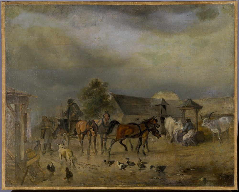 Obraz przedstawia wiejskie podwórze, na które wjechaÅ‚ zaprzężonÄ… w cztery konie bryczkÄ… przybysz, oczekiwany przez stojÄ…cego obok mężczyznÄ™. Scenie przyglÄ…dajÄ… siÄ™ dwa psy, a nieopodal pasie siÄ™ stadko drobiu. W głębi mężczyzna poi u studni dwa woÅ‚y.