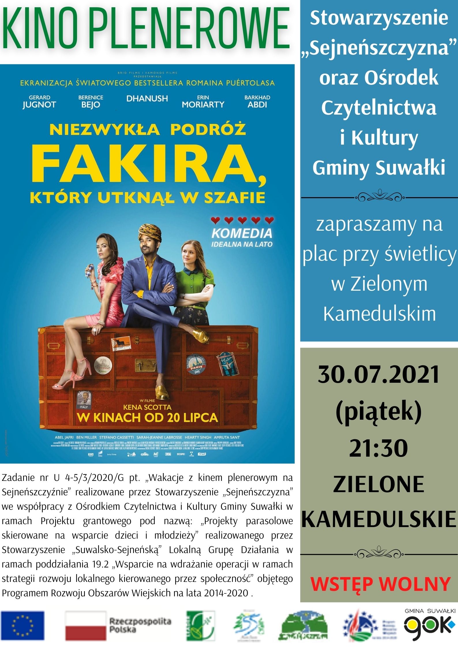 Zadanie nr U 4-5/3/2020/G pt. „Wakacje z kinem plenerowym na SejneÅ„szczyźnie” realizowane przez Stowarzyszenie „SejneÅ„szczyzna” we wspóÅ‚pracy z OÅ›rodkiem Czytelnictwa i Kultury Gminy SuwaÅ‚ki w ramach Projektu grantowego pod nazwÄ…: „Projekty parasolowe skierowane na wsparcie dzieci i mÅ‚odzieży” realizowanego przez Stowarzyszenie „Suwalsko-SejneÅ„skÄ…” LokalnÄ… GrupÄ™ DziaÅ‚ania w ramach poddziaÅ‚ania 19.2 „Wsparcie na wdrażanie operacji w ramach strategii rozwoju lokalnego kierowanego przez spoÅ‚eczność” objÄ™tego Programem Rozwoju Obszarów Wiejskich na lata 2014-2020 .