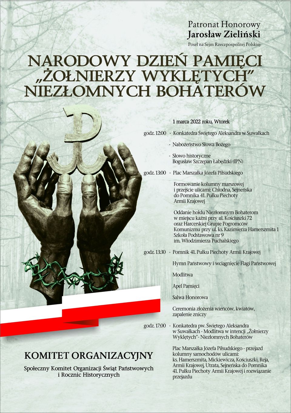 Poseł RP Jarosław Zieliński w imieniu wszystkich Organizatorów oraz własnym zaprasza na jutrzejsze (wtorek, 1 marca) obchody Narodowego Dnia Pamięci Żołnierzy Wyklętych, które odbędą się w Suwałkach.