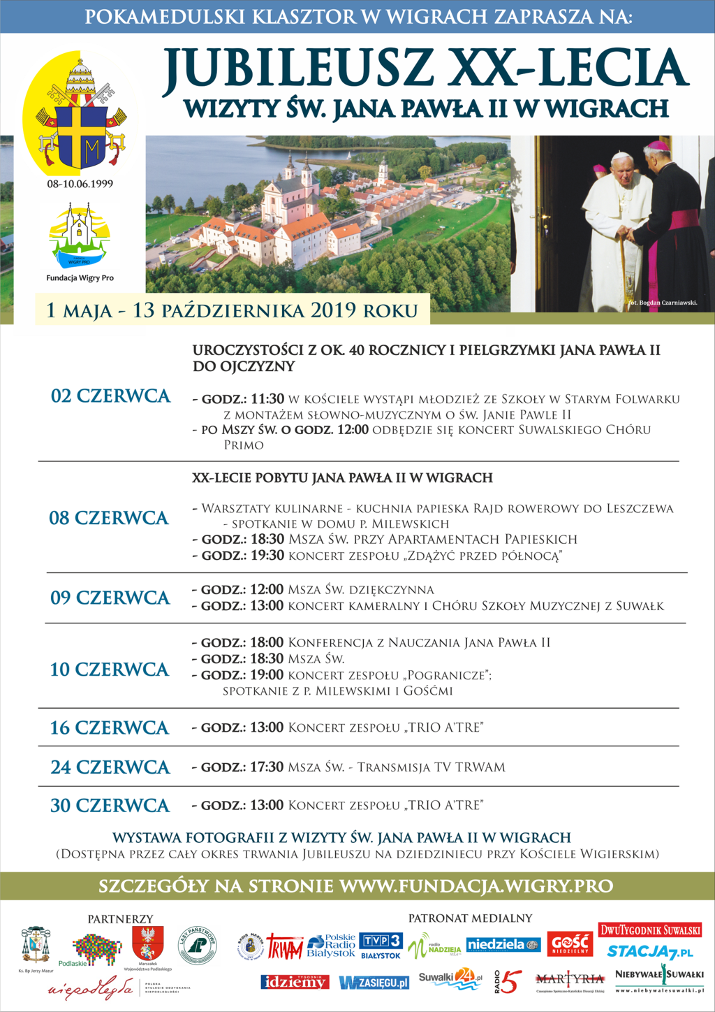 Fundacja Wigry Pro zaprasza do wzięcia udziału w czerwcowych wydarzeniach przygotowanych z okazji dwudziestej rocznicy wizyty Papieża Jana Pawła II w Wigrach.