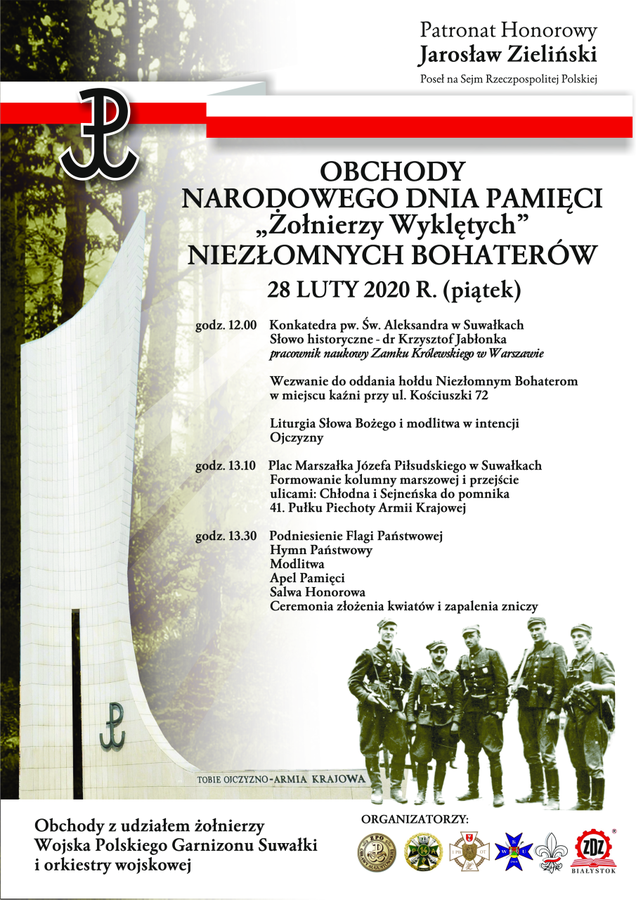 W piątek w Suwałkach odbędą się Obchody Narodowego Dnia Pamięci "Żołnierzy Wyklętych". Rozpoczną się o 12.00 w konkaterze pw. św. Aleksandra. Słowo historyczne wygłosi dr Krzysztof Jabłonka z Warszawy.