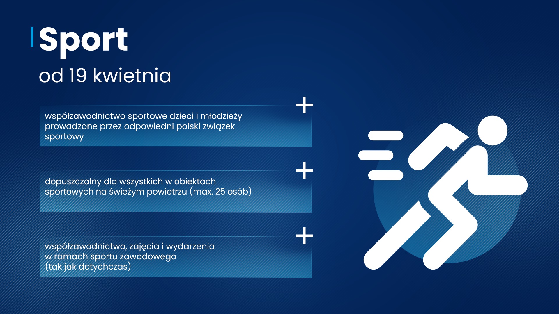 - Sport – dziaÅ‚alność obiektów sportowych nadal jest ograniczona wyłącznie do sportu zawodowego. Wszelkie wydarzenia mogÄ… siÄ™ odbywać bez udziaÅ‚u publicznoÅ›ci. ZamkniÄ™te pozostajÄ… m.in. siÅ‚ownie, kluby fitness, stoki narciarskie, baseny, sauny i solaria. Od 19 kwietnia dopuszczamy możliwość uczestnictwa dzieci i mÅ‚odzieży we wspóÅ‚zawodnictwie sportowym prowadzonym przez odpowiedni polski zwiÄ…zek sportowy. Zgadzamy siÄ™ również na uprawianie sportu w obiektach sportowych na Å›wieżym powietrzu – limit do 25 osób.