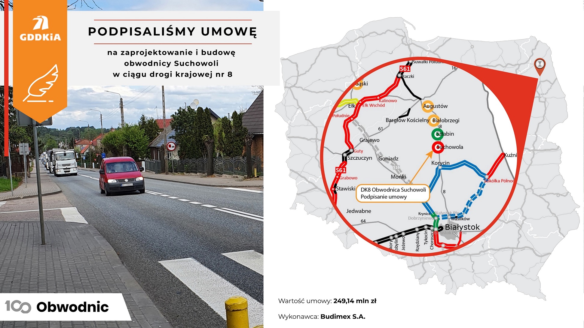Generalna Dyrekcja Dróg Krajowych i Autostrad podpisała umowę na zaprojektowanie i budowę obwodnicy Suchowoli w ciągu drogi krajowej nr 8, na odcinku łączącym Białystok z Augustowem.