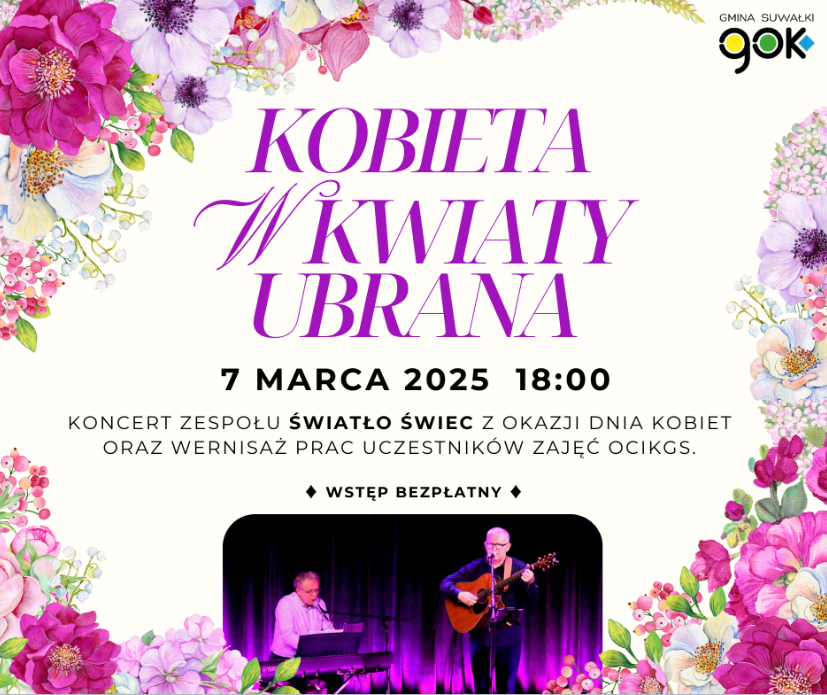 W piątek, 7 marca o godz. 18:00 Ośrodek Czytelnictwa i Kultury Gminy Suwałki w Krzywym zaprasza na koncert zespołu Światło Świec z okazji Dnia Kobiet oraz na wernisaż prac uczestników zajęć OCiKGS.
