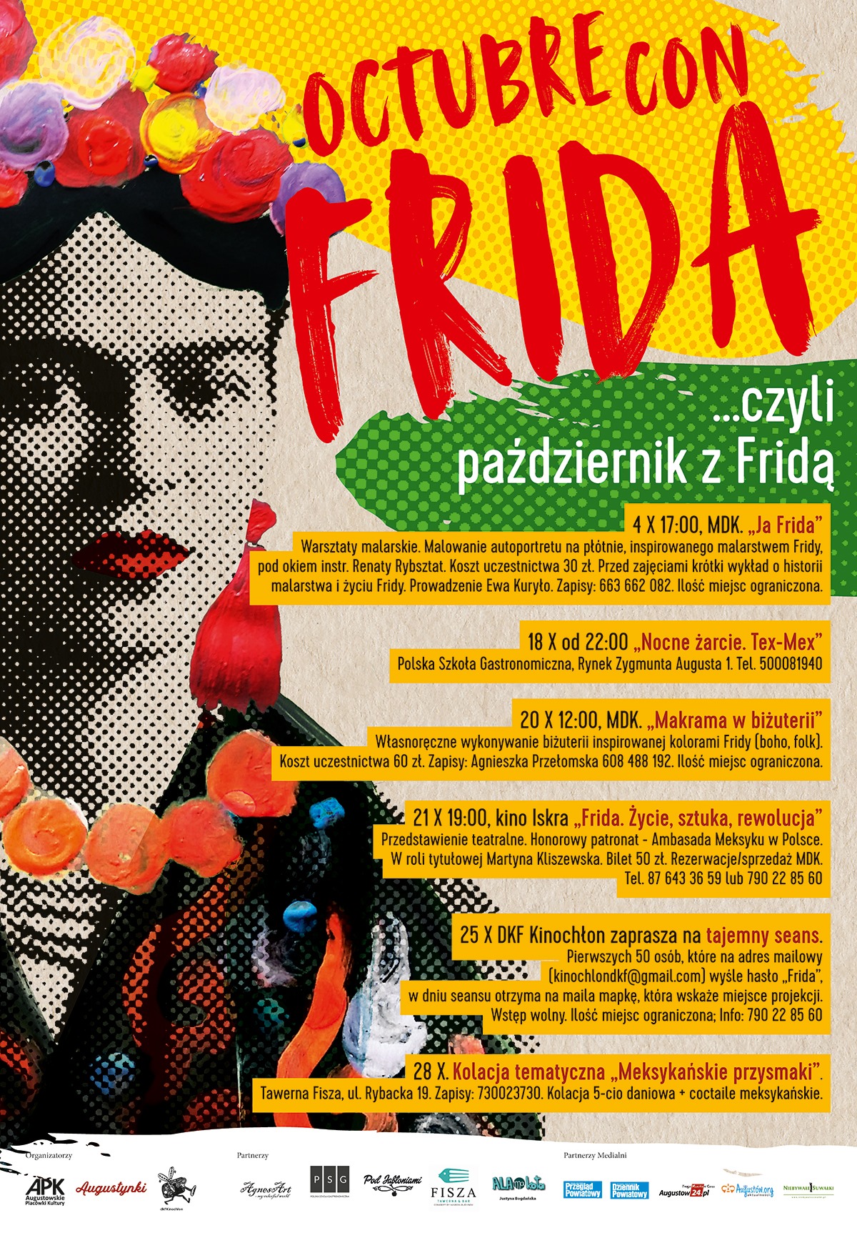 Augustowskie Placówki Kultury, DKF KINOCHŁON i Augustynki zapraszają na fantastycznie kolorowy Październik z Fridą Kahlo. Meksykańska artystka i jej twórczość fascynuje, pociąga i przez swój barwny charakter kojarzy się z popkulturą. Nie dajemy się jesiennej plusze i zapraszamy Państwa do świata barw Fridy Kahlo.