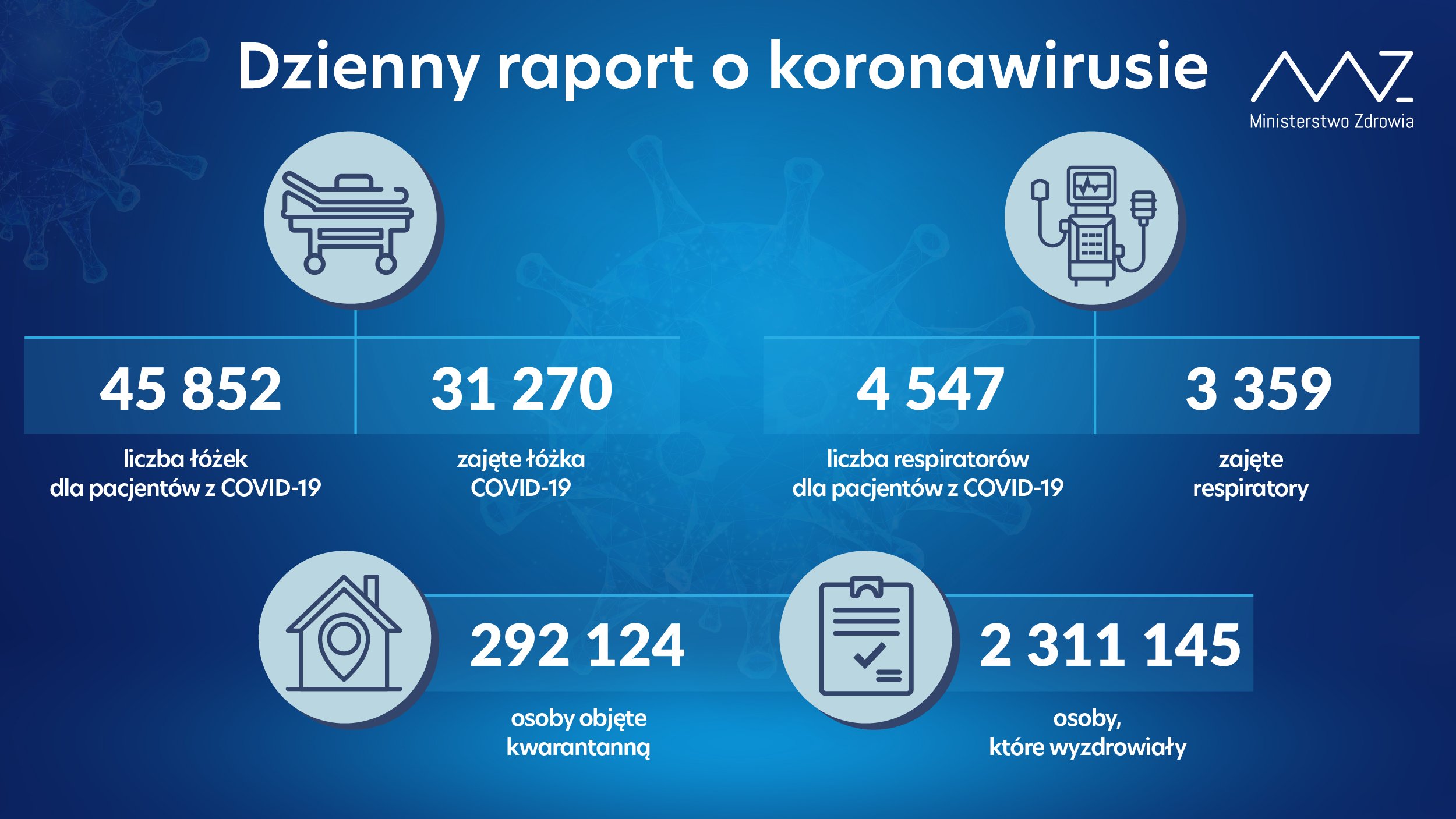 Od poczÄ…tku pandemii w Polsce koronawirusa wykryto u 2 688 025 osób. ZmarÅ‚y 62 063 osoby, wyzdrowiaÅ‚o 2 311 145.