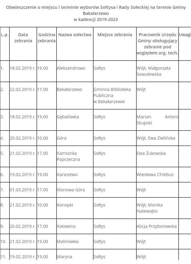 W Gminie BakaÅ‚arzewo soÅ‚tysi bÄ™dÄ… wybierani w nastÄ™pujÄ…cych miejscowoÅ›ciach: Aleksandrowo, BakaÅ‚arzewo, GÄ™balówka, Góra, Kamionka Poprzeczna, Karasiewo, Klonowa Góra, Konopki, Kotowina, Malinówka, Maryna, MatÅ‚ak, Nieszki, Nowa Kamionka, Nowa WieÅ›, Nowy Dwór, Nowy Skazdub, OrÅ‚owo, PÅ‚ociczno, Podwólczanka, SadÅ‚owina, SÅ‚upie, SokoÅ‚owo, Stara Chmielówka, Stara Kamionka, Stary Skazdub, Suchorzec, Wólka, Wólka - Folwark, ZajÄ…czkowo, ZajÄ…czkowo - Folwark i ZdrÄ™by zarzÄ…dzam, co nastÄ™puje: